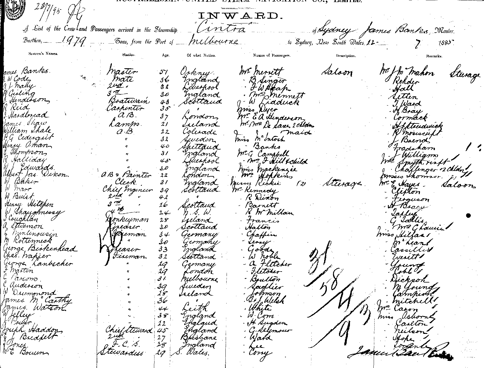 CINTRAOF SYDNEY, JAMES BANKS, MASTER, BURTHEN 1979TONS FROM THE PORT OF MELBOURNE TO SYDNEY, NEW SOUTH WALES, 22 JULY, 1895 |