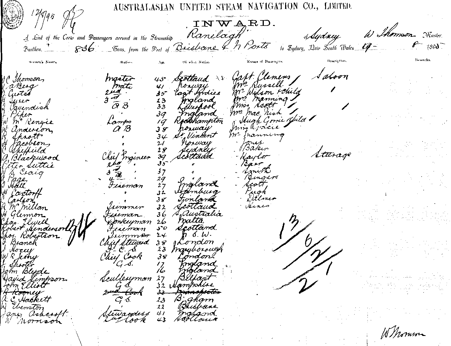 RANELAGHOF SYDNEY, W. THOMSON, MASTER, BURTHEN 836 TONS FROM THE PORT OF BRISBANE & N PORTS, TO SYDNEY, NEW SOUTH WALES, 9 AUGUST, 1895 |