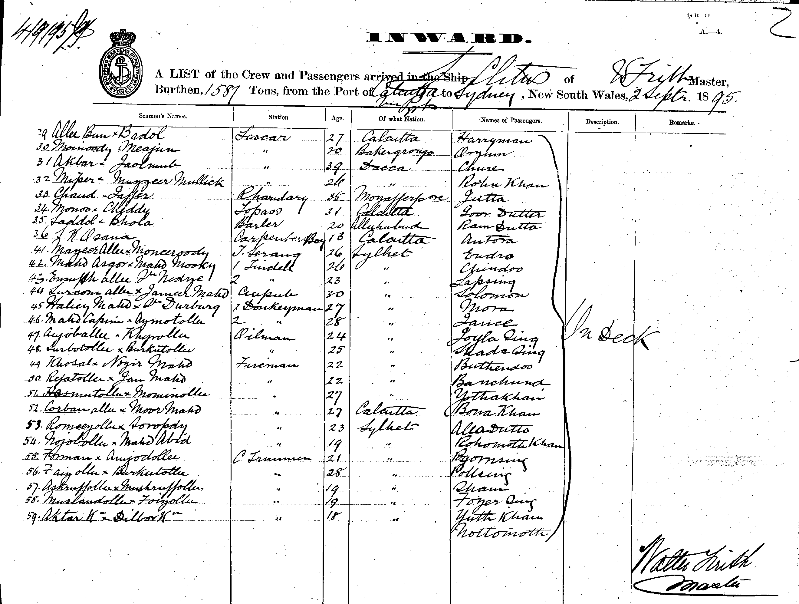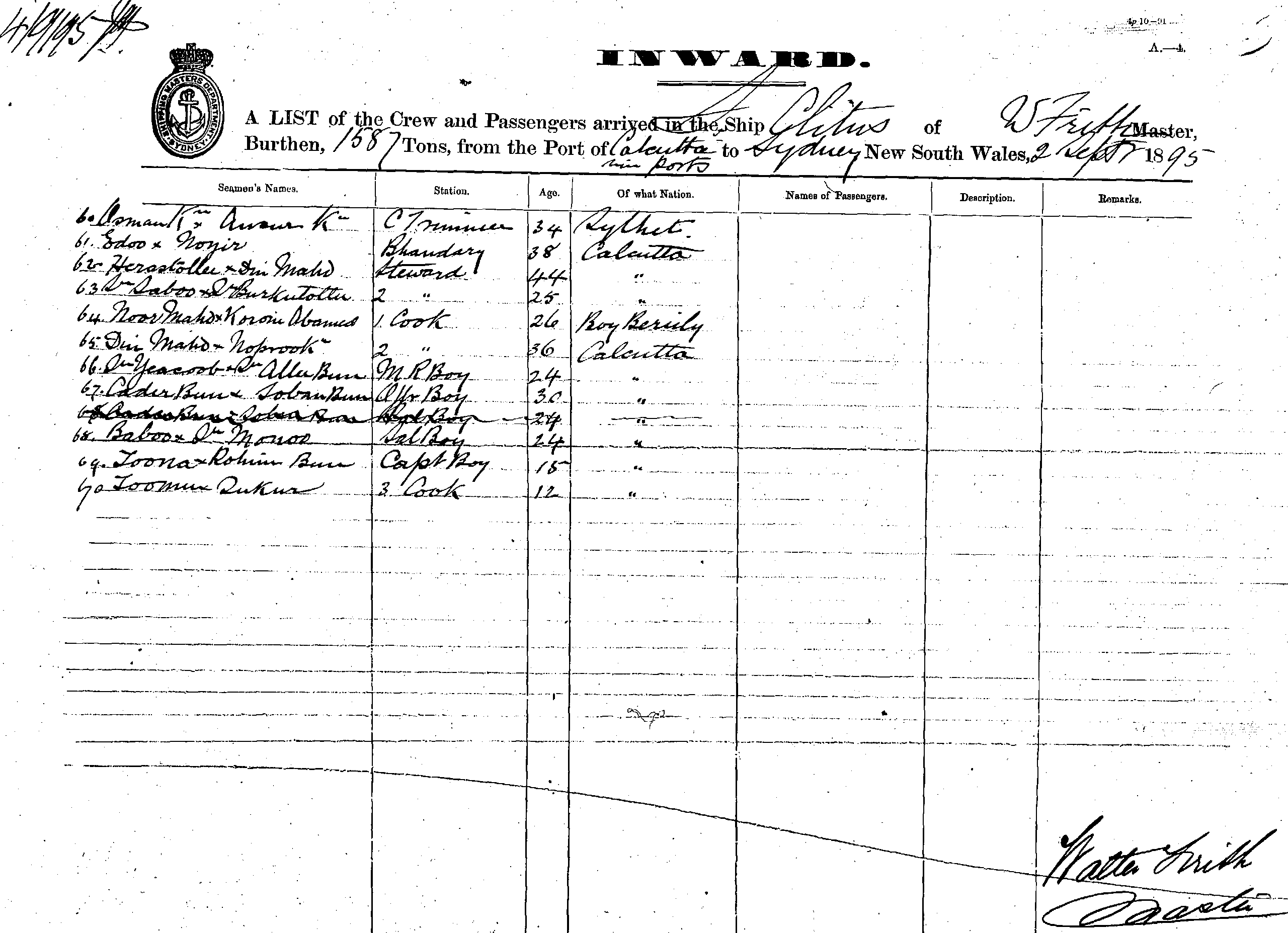 CLITUSOF ?, W. FRITH, MASTER, BURTHEN 1587 TONS FROM THE PORT OF CALCUTTA VIA PORTS TO SYDNEY, NEW SOUTH WALES, 2ND SEPTMBER, 1895 |