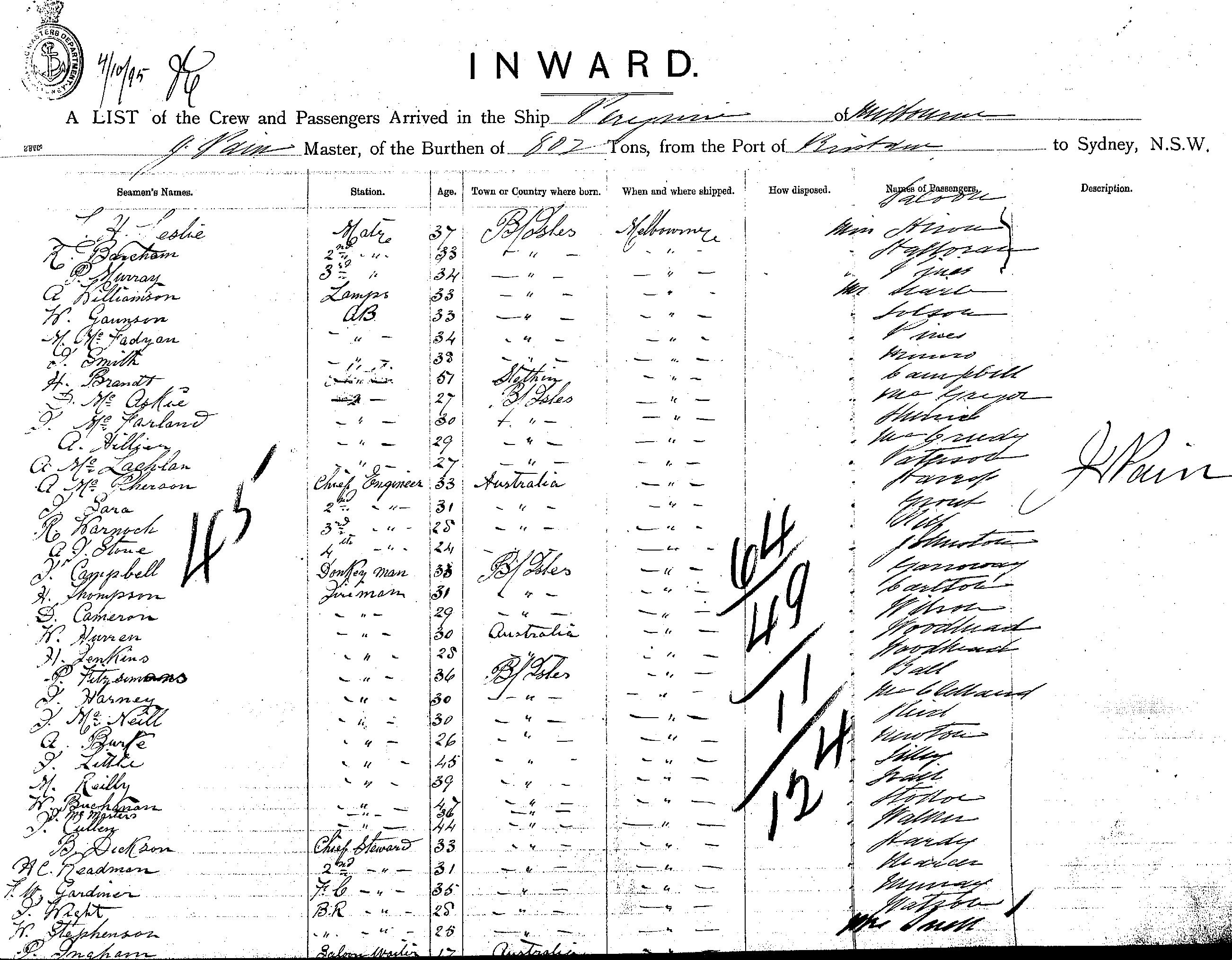 PEREGRINEPEREGRINE OF MELBOURNE , J. PAIN, MASTER, BURTHEN 802 TONS FROM THE PORT OF BRISBANE TO SYDNEY, NEW SOUTH WALES, 4TH OCTOBER 1895 |