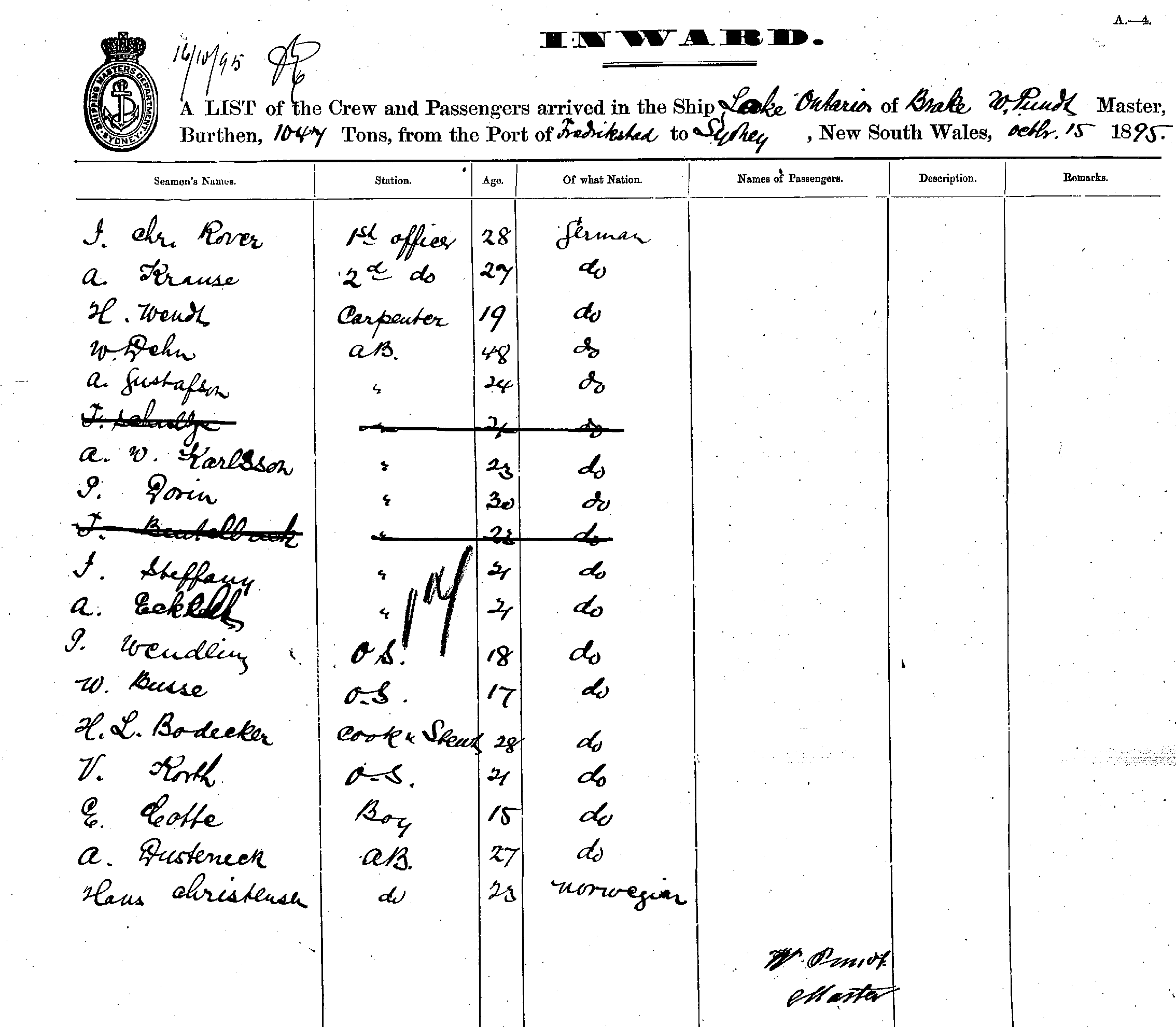 LAKE ONTARIOOF BRAKE, W. PUNDT, MASTER, BURTHEN 1047 TONS FROM THE PORT OF FREDRICKSTAD TO SYDNEY, NEW SOUTH WALES, OCTOBER 15, 1895 |