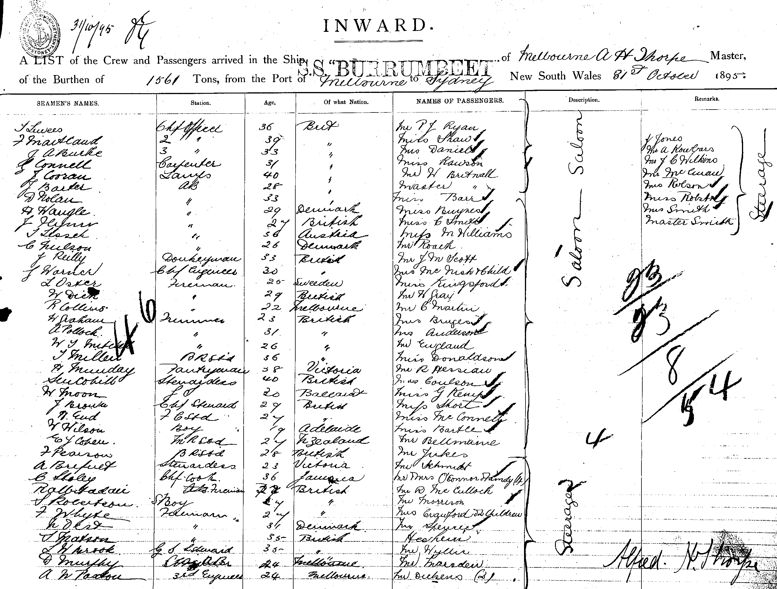 BURRUMBEETOF MELBOURNE, A H THORPE, MASTER, BURTHEN 1561 TONS FROM THE PORT OF MELBOURNE TO SYDNEY, NEW SOUTH WALES, 31 OCTOBER, 1895 |