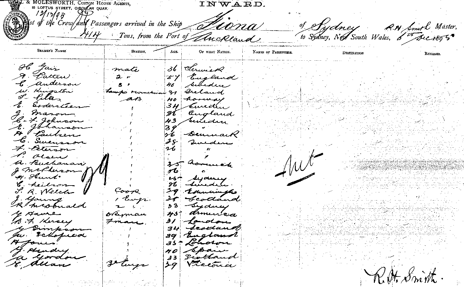 FIONAOF SYDNEY, R. H. SMITH, MASTER, BURTHEN 414 TONS FROM THE PORT OF AUCKLAND TO SYDNEY, NEW SOUTH WALES, 6 DEC 1895 |