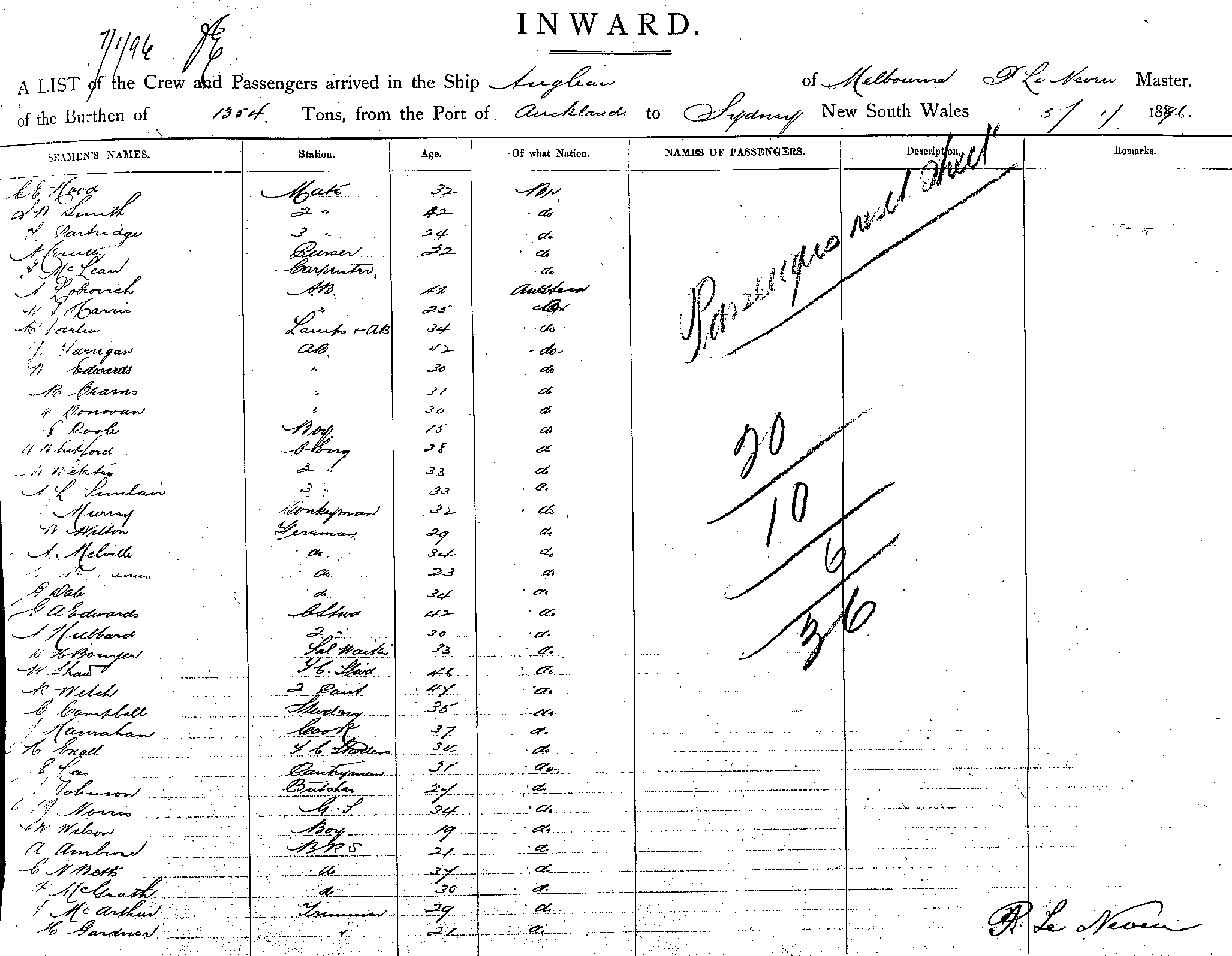 ANGLIANOF MELBOURNE, P. LE NEVEN, MASTER, BURTHEN 1354 TONS FROM THE PORT OFAUCKLAND TO SYDNEY, NEW SOUTH WALES, 5TH JANUARY 1896 |