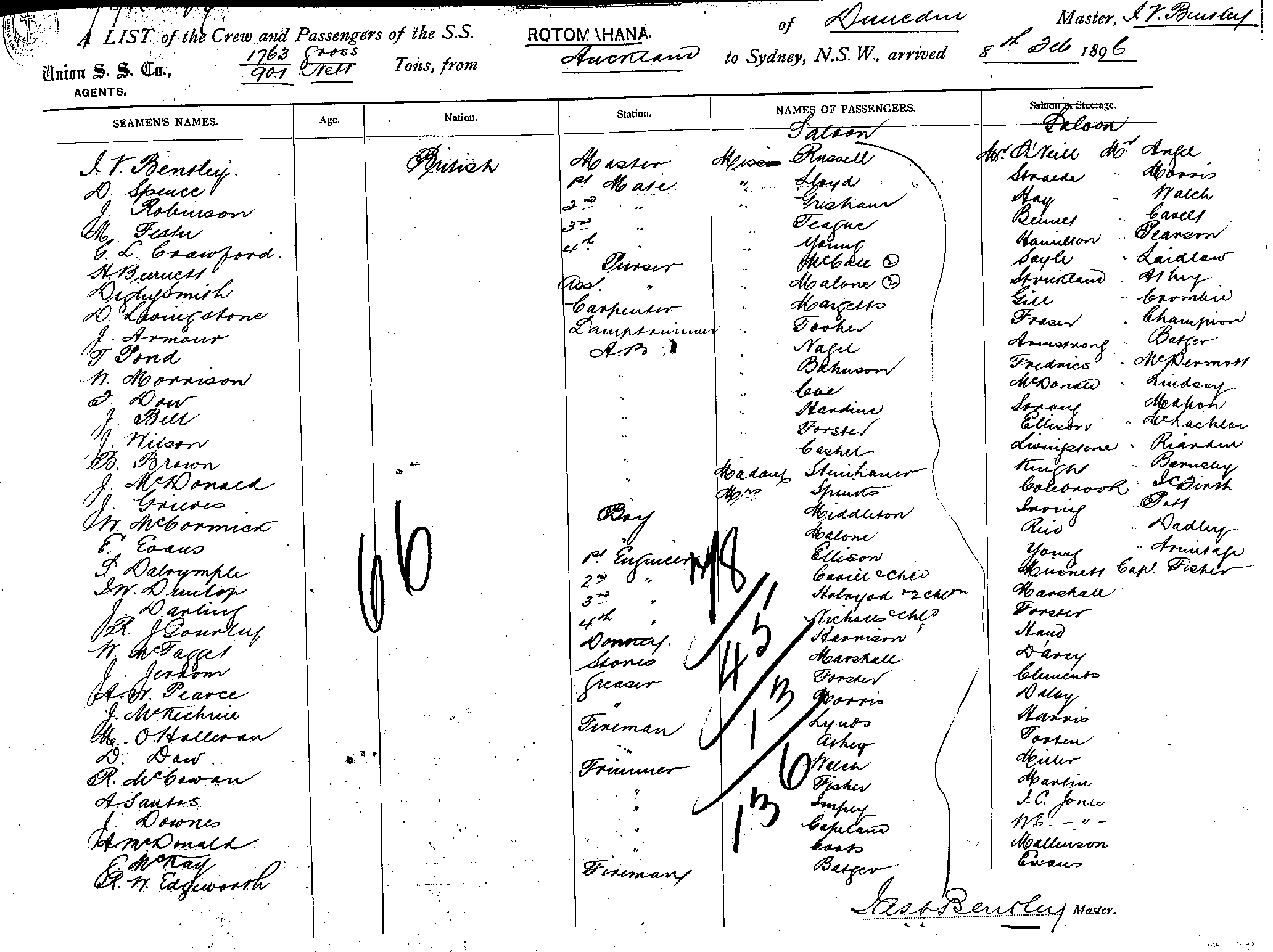 ROTOMAHANAOF DUNEDIN, J. V. BENTLEY, MASTER, BURTHEN 1763/901 TONS FROM THE PORT OF AUCKLAND TO SYDNEY, NEW SOUTH WALES, 8TH FEBRUARY 1896 |