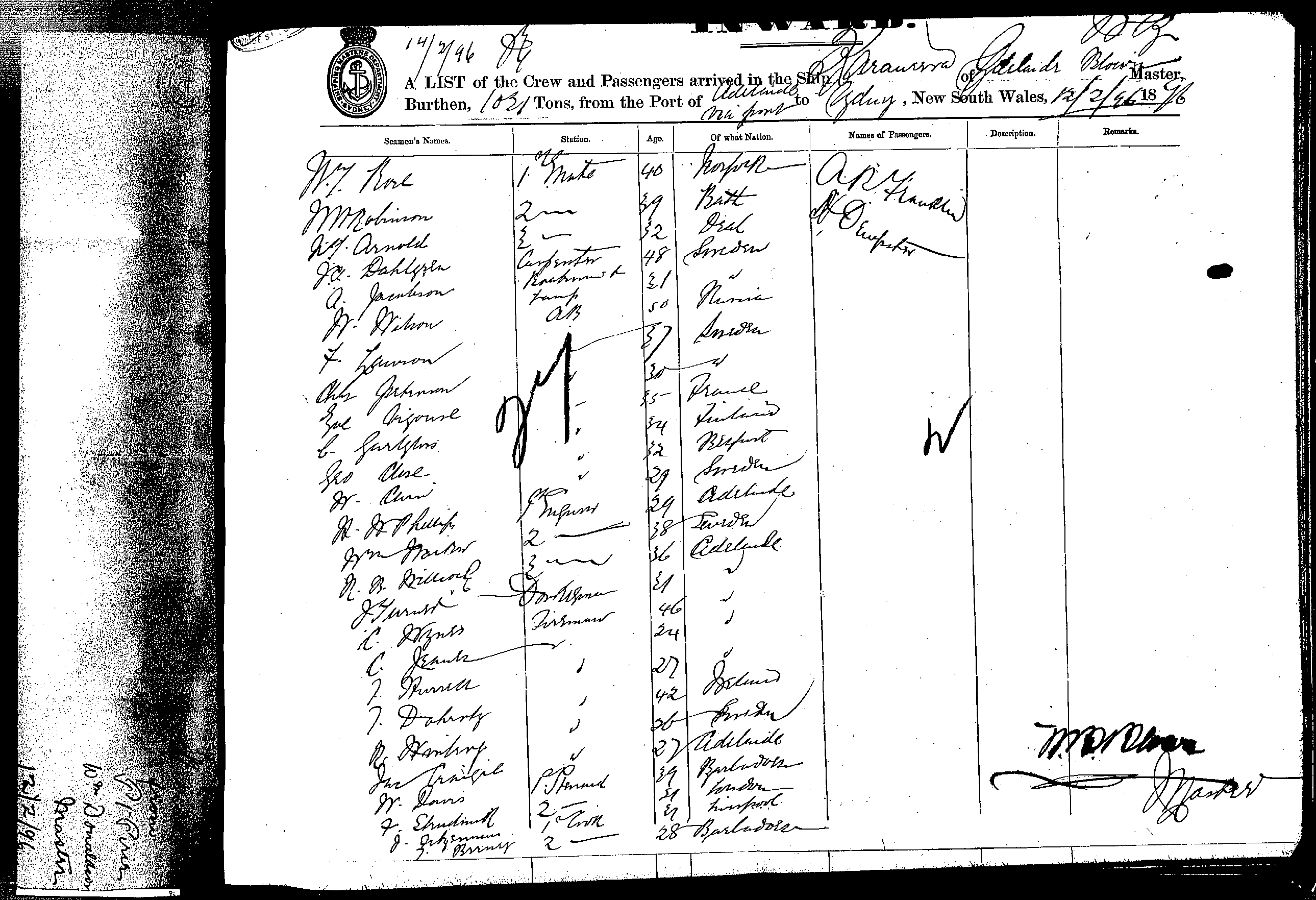 KARAWARRAOF ADELAIDE, W. D. BLOWN, MASTER, BURTHEN 1021 TONS FROM THE PORT OF ADELAIDE VIA PORTS TO SYDNEY, NEW SOUTH WALES, 12TH FEBRUARY 1896 |