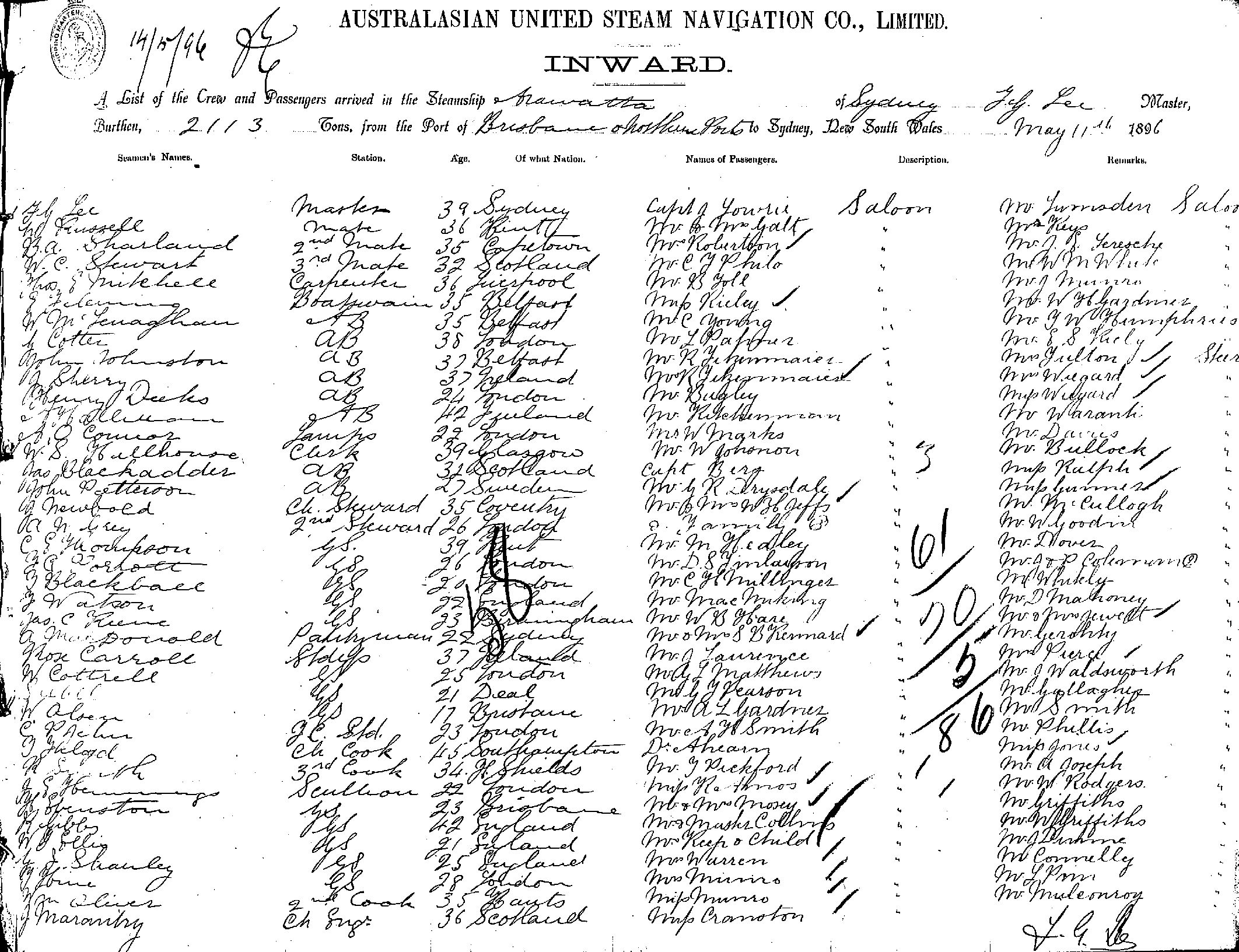 ARAWATTAOF SYDNEY, F G LEE, MASTER, BURTHEN 2113 TONS FROM THE PORT OF BRISBANE & NORTHERN PORTS TO SYDNEY, NEW SOUTH WALES, 11TH MAY, 1896 |