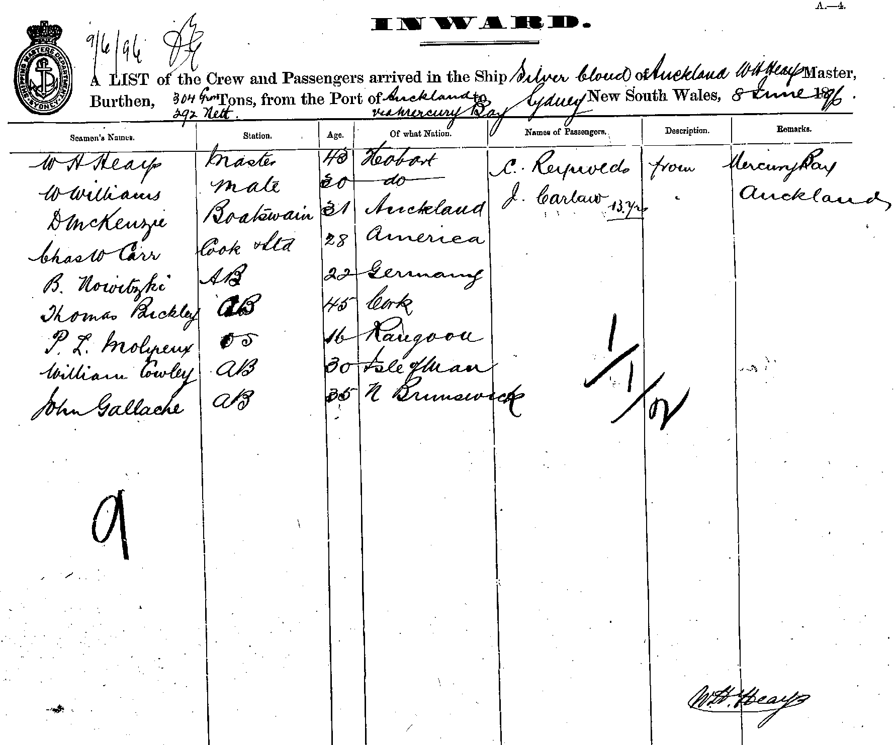 SILVER CLOUDOF AUCKLAND, W. H. HEAYS, MASTER, BURTHEN 304/292 TONS FROM THE PORT OF AUCKLAND via MERCURY BAY TO SYDNEY, NEW SOUTH WALES, 8TH JUNE 1896 |