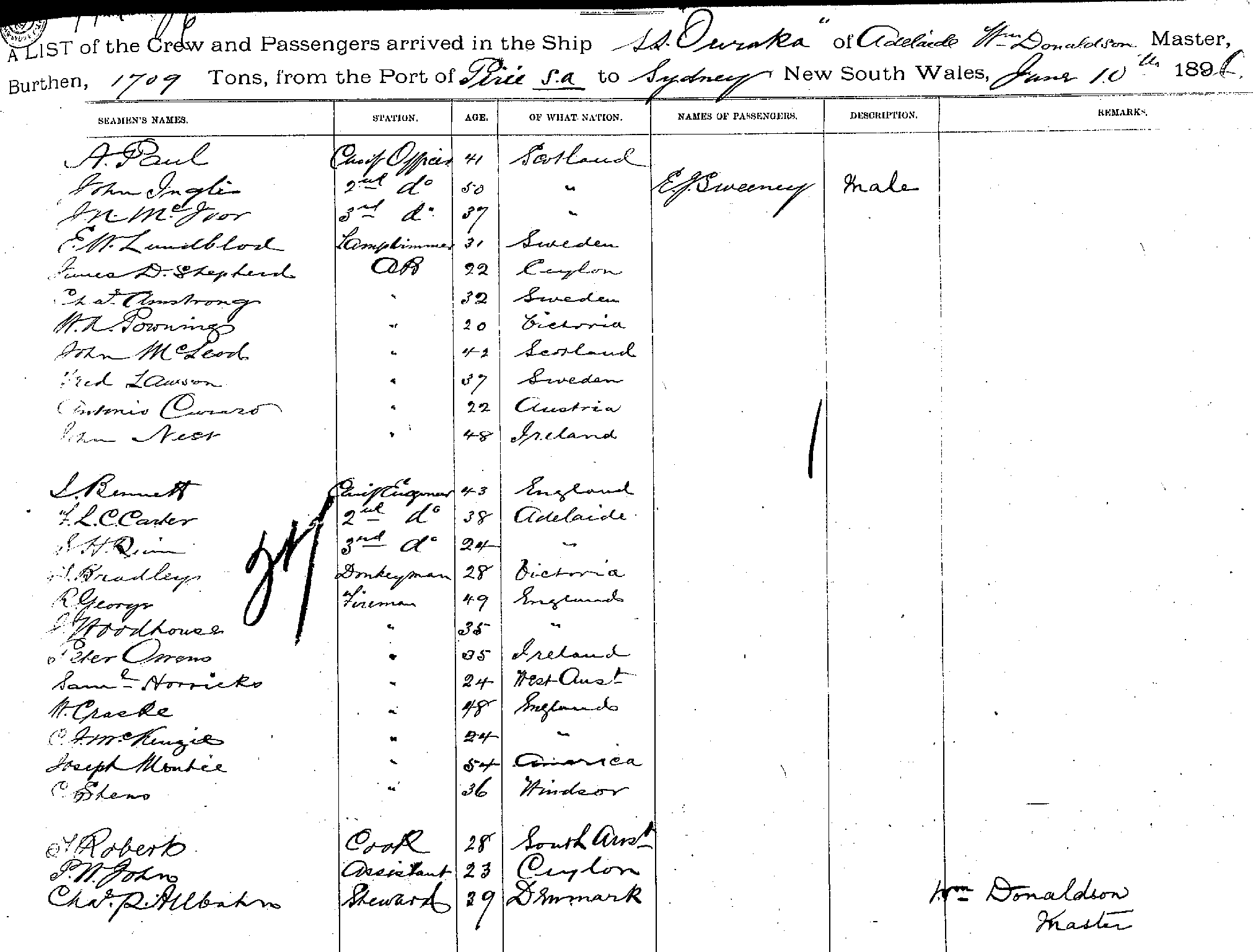 OURAKAOF ADELAIDE, WILLIAM DONALDSON, MASTER, BURTHEN 1709 TONS FROM THE PORT OF PIRIE S. A., TO SYDNEY, NEW SOUTH WALES, 10TH JUNE 1896 |