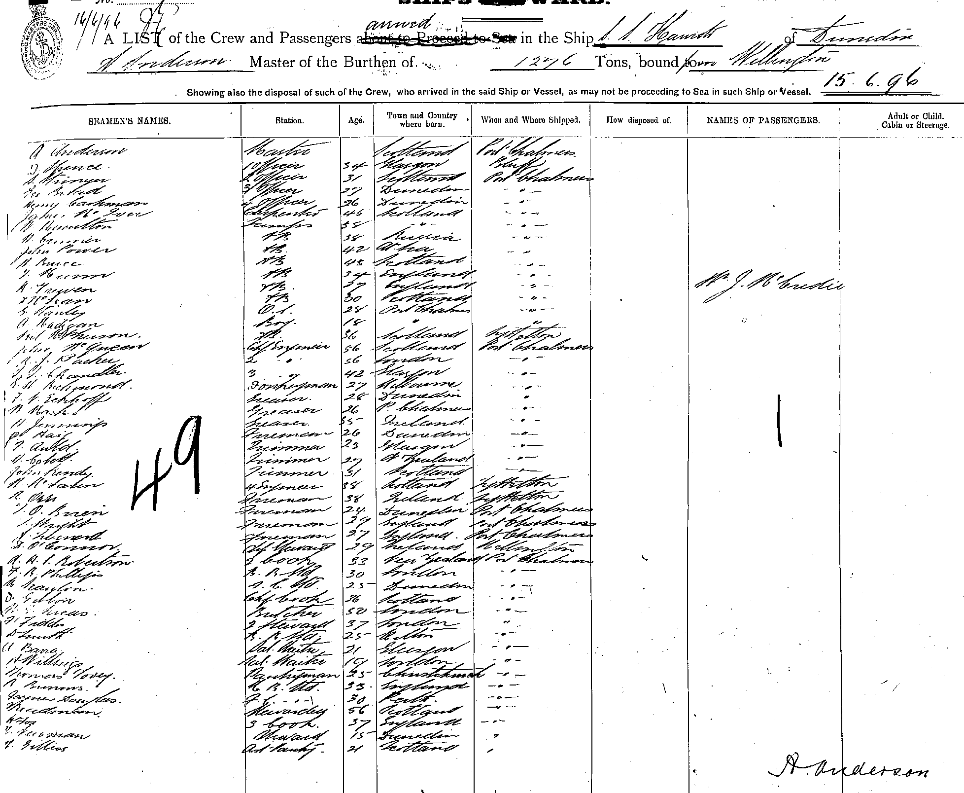 HAUROTOOF DUNEDIN, A. ANDERSON, MASTER, BURTHEN 1276 TONS FROM THE PORT OF WELLINGTON TO SYDNEY, NEW SOUTH WALES, 15TH JUNE 1896 |