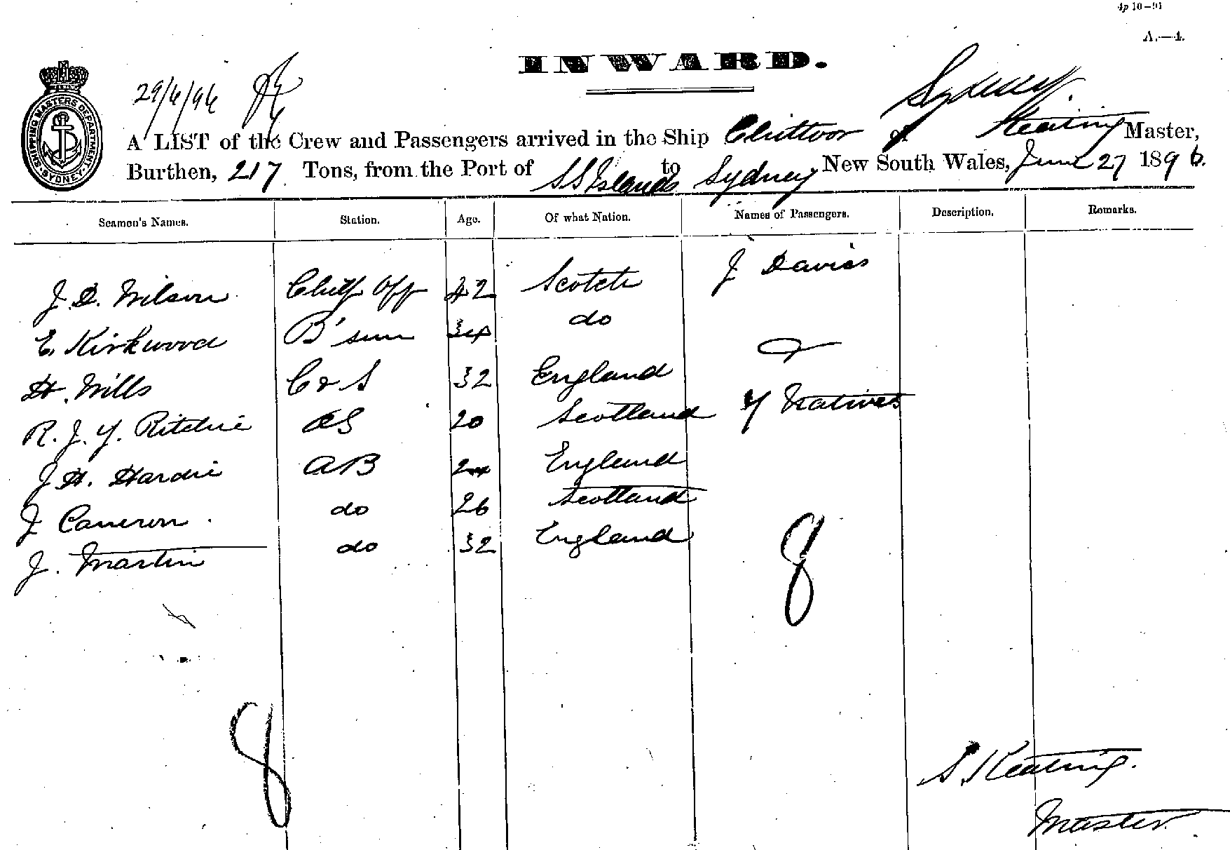 CHITTOOROF SYDNEY, S. KEATING, MASTER, BURTHEN 217 TONS FROM THE PORT OF S. S. ISLANDS TO SYDNEY, NEW SOUTH WALES, 27TH JUNE 1896 |