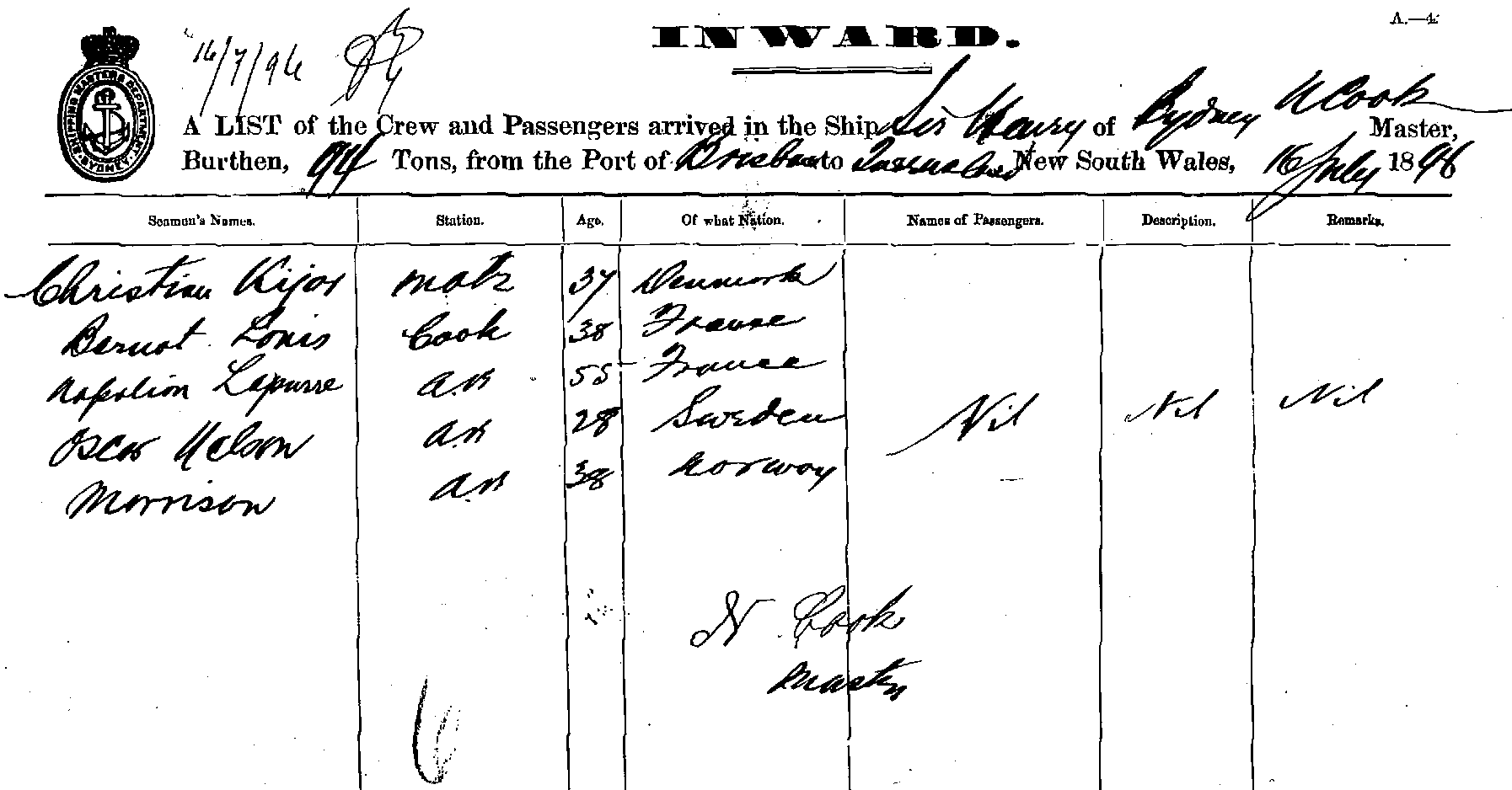 SIR HENRYOF SYDNEY, N. COOK, MASTER, BURTHEN 94 TONS, FROM THE PORT OF BRISBANE TO SYDNEY, NEW SOUTH WALES, 16TH JULY 1896 |