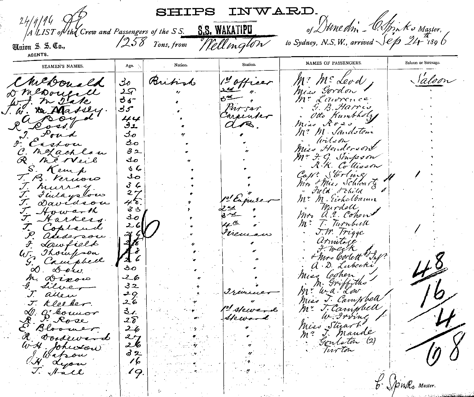 WAKATIPUOF DUNEDIN, C. SPINKS, BURTHEN 1258 TONS FROM THE PORT OF WELLINGTON TO SYDNEY, NEW SOUTH WALES, 24TH SEPTEMBER 1896 |