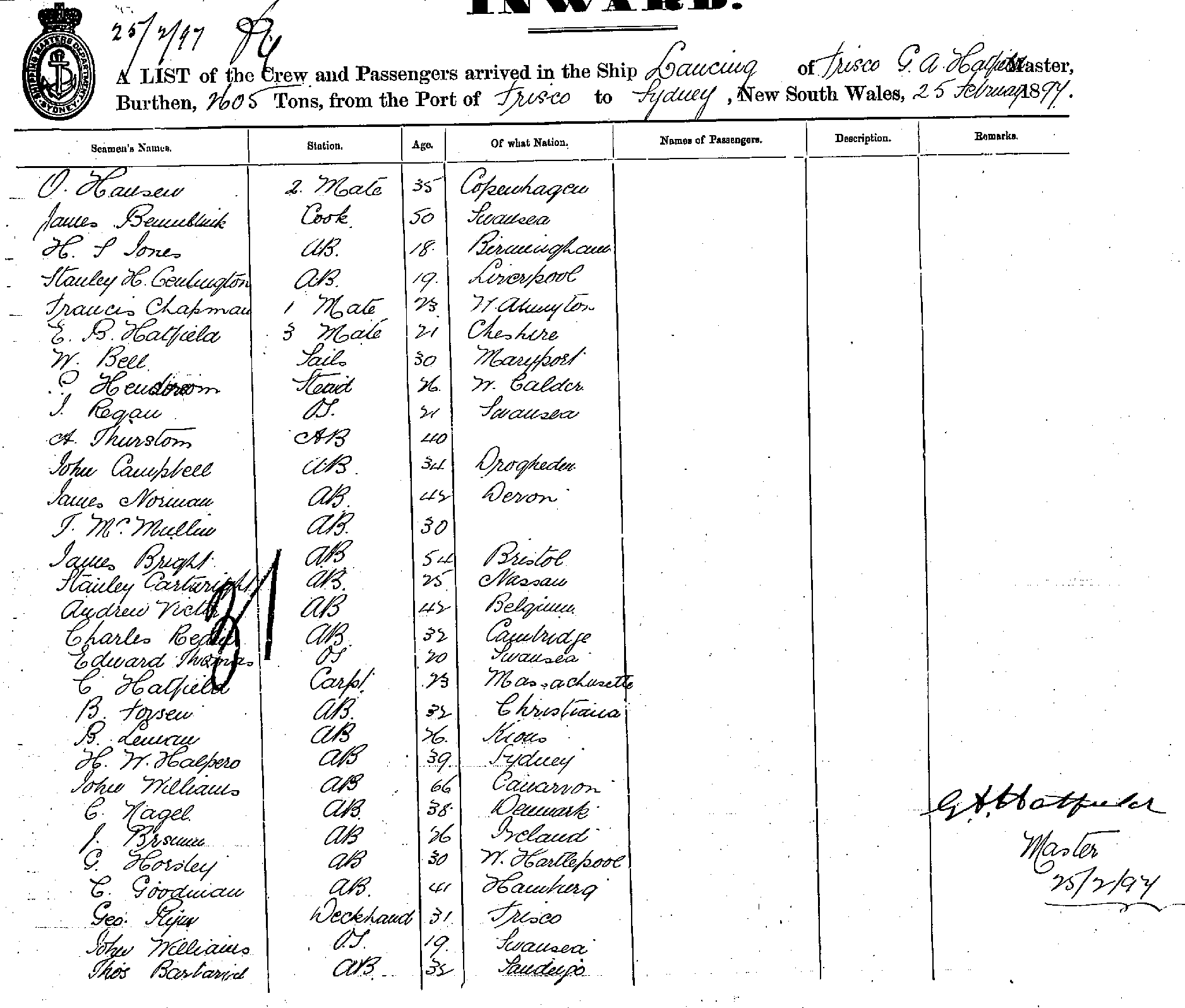 LANCINGOF SAN FRANCISCO, G.A. HATFIELD, MASTER OF BURTHEN 2605 TONS FROM THE PORT OF SAN FRANCISCO TO SYDNEY, NEW SOUTH WALES 25 FEBRUARY 1897 |