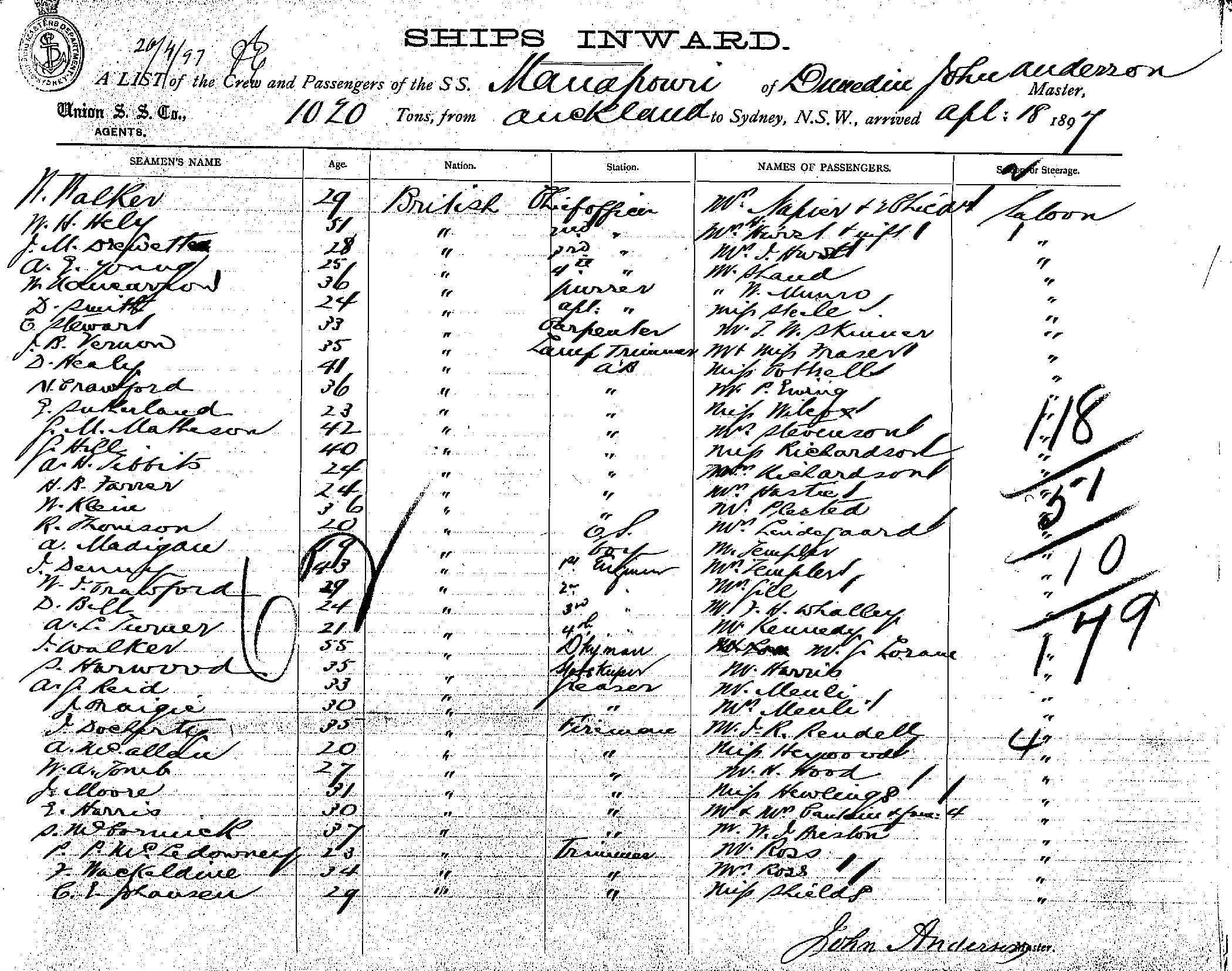 MANAPOURIOF DUNEDIN, JOHN ANDERSON, MASTER, BURTHEN 1020 TONS FROM THE PORT OF AUCKLAND TO SYDNEY, NEW SOUTH WALES, 18 APRIL 1897 |