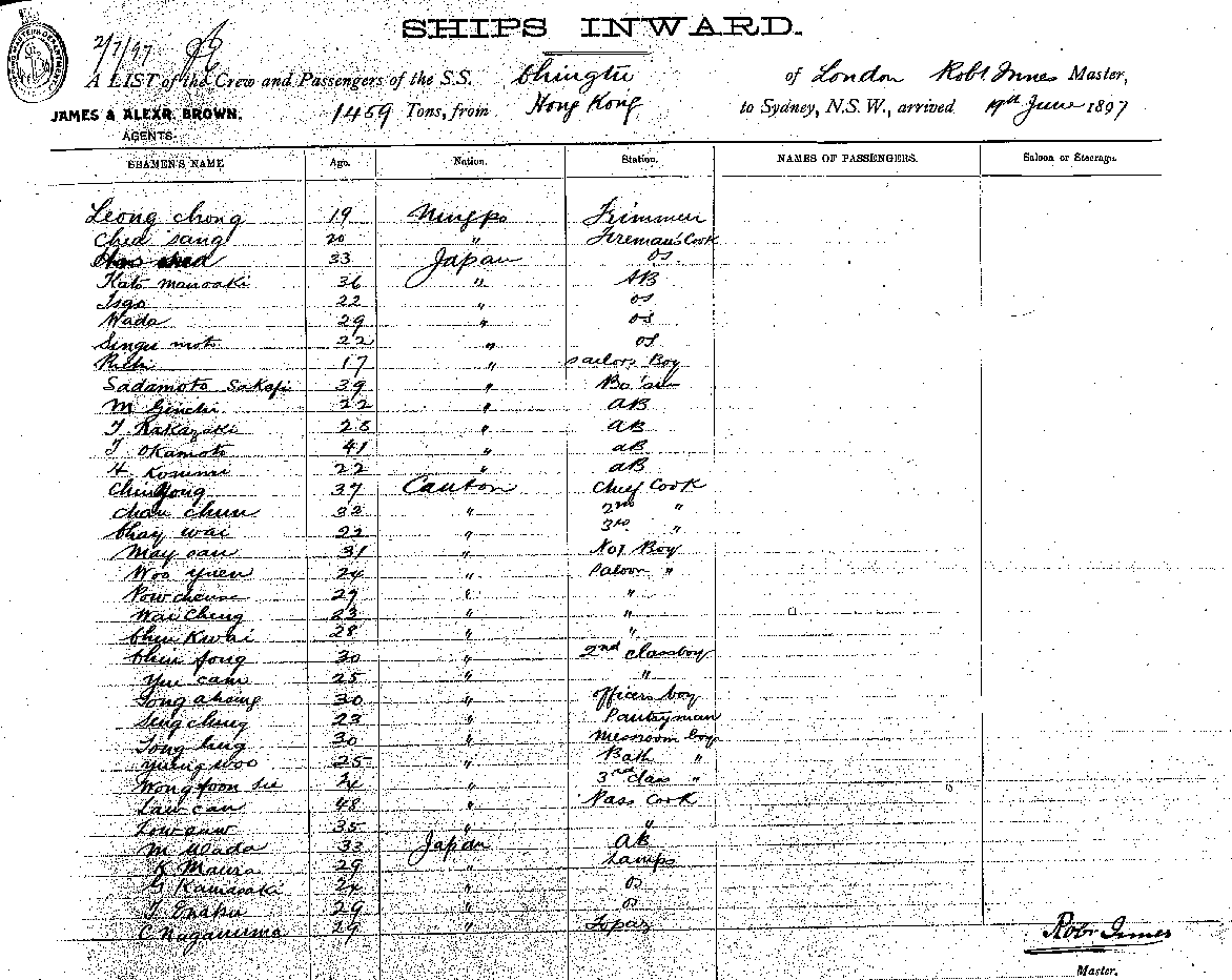 CHINGTUOF LONDON, R. INNES, MASTER, BURTHEN 1459 TONS FROM THE PORT OF HONG KONG TO SYDNEY, NEW SOUTH WALES, 19TH JUNE 1897 |