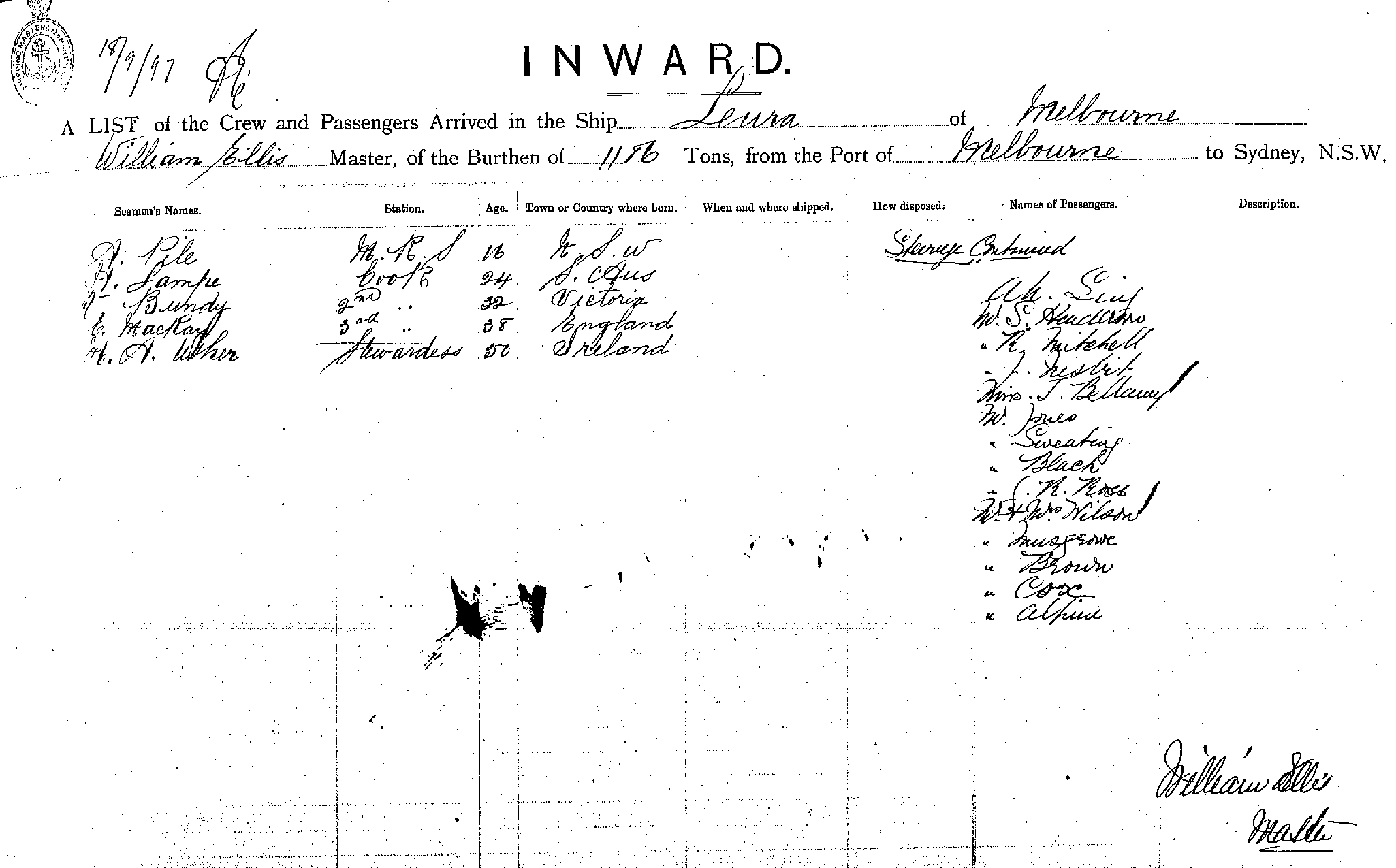 LEURAOF MELBOURNE, WILLIAM ELLIS, MASTER, BURTHEN 1186 TONS FROM THE PORT OF MELBOURNE TO SYDNEY, NEW SOUTH WALES, SEPT 1897 |