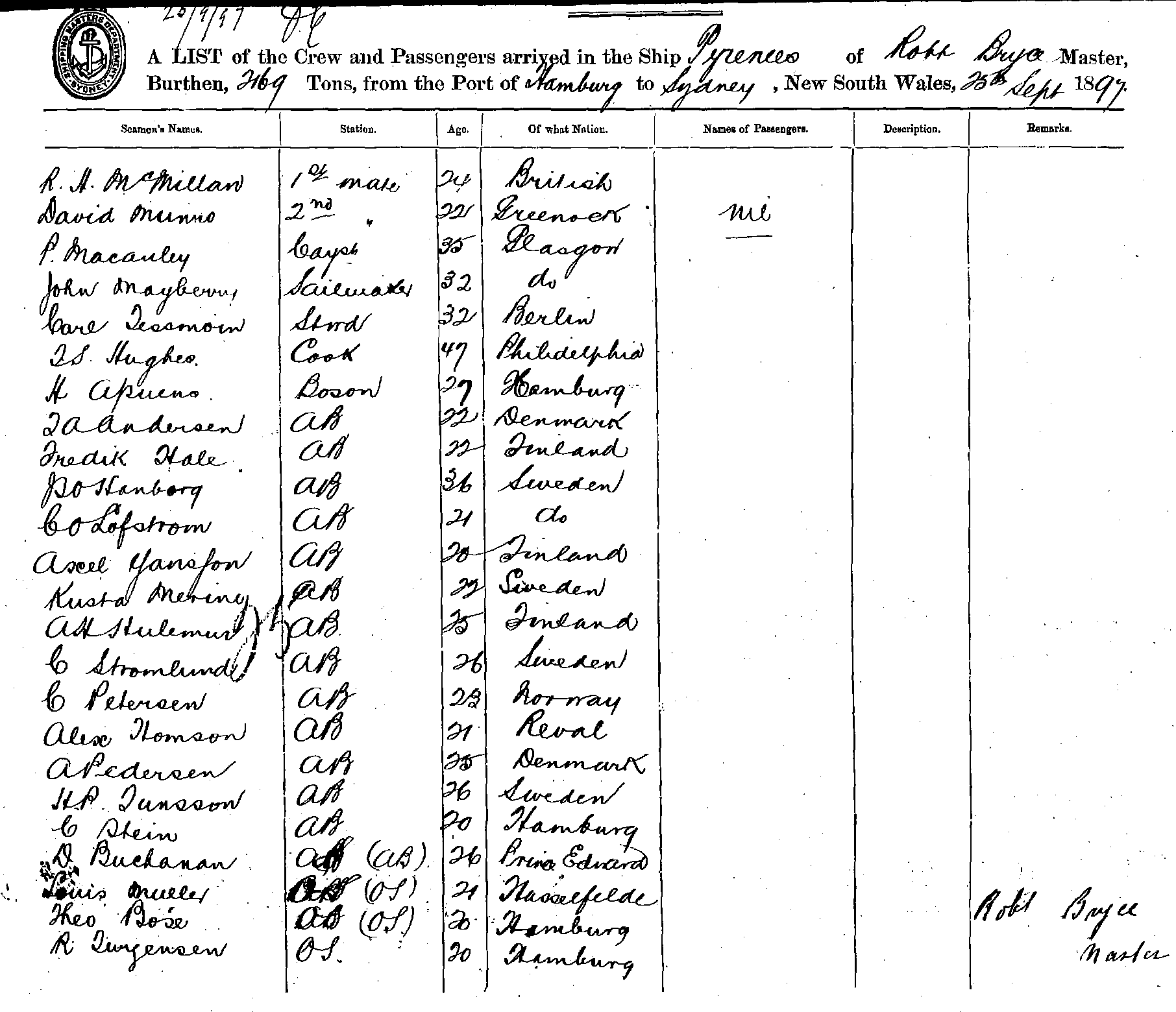 PYRENEESOF ROBT BRYCE, MASTER, BURTHEN 2169 TONS FROM THE PORT OF HAMBURY TO SYDNEY, NEW SOUTH WALES, 25TH SEPTEMBER 1897 |