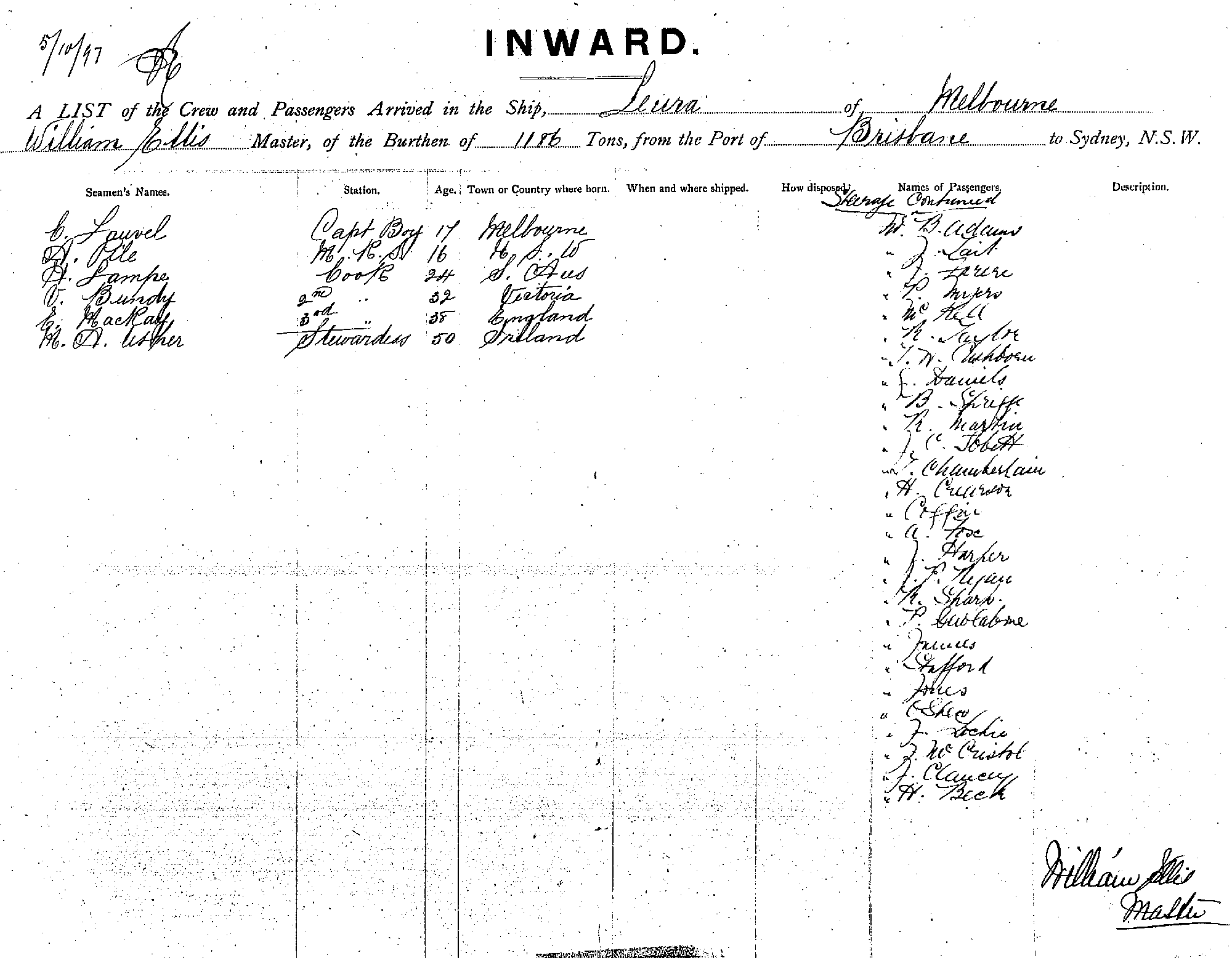 LEURAOF MELBOURNE, WILLIAM ELLIS , MASTER, BURTHEN 1186 TONS FROM THE PORT OF BRISBANE TO SYDNEY, NEW SOUTH WALES, ? OCTOBER 1897 |