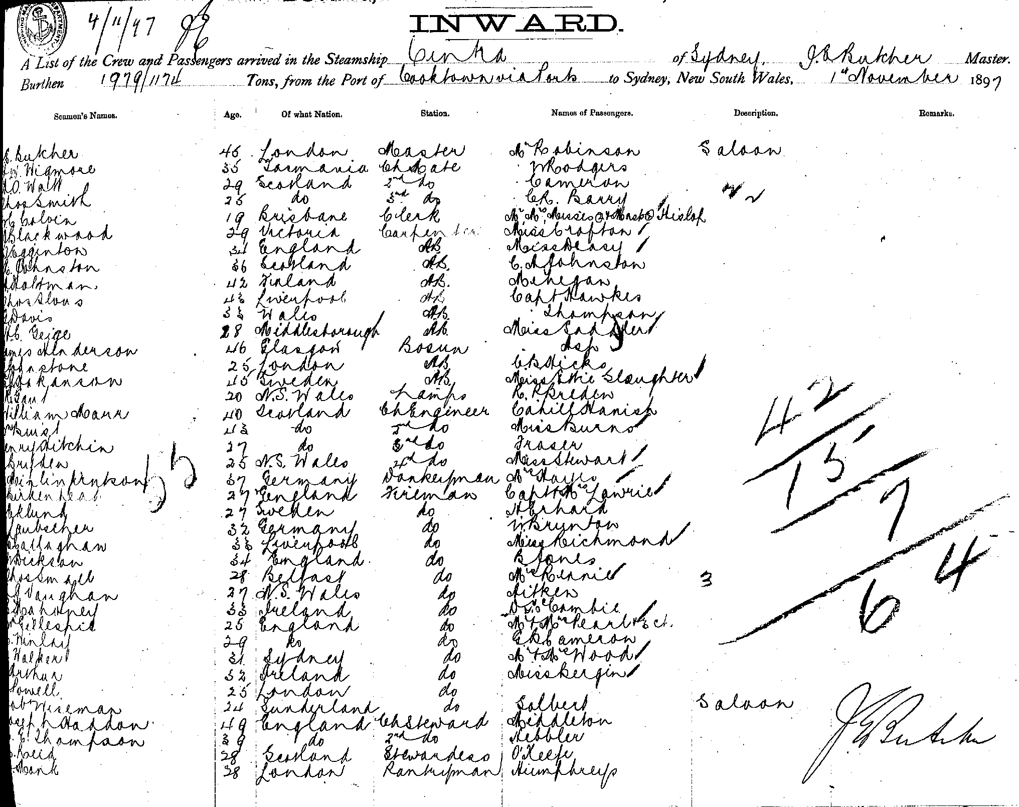 CINTRAOF SYDNEY, J. E. BUTCHER MASTER, BURTHEN 1979/1174 TONS FROM THE PORT OF COOKTOWN VIA PORTS TO SYDNEY, NEW SOUTH WALES, 1ST NOVEMBER, 1897 |