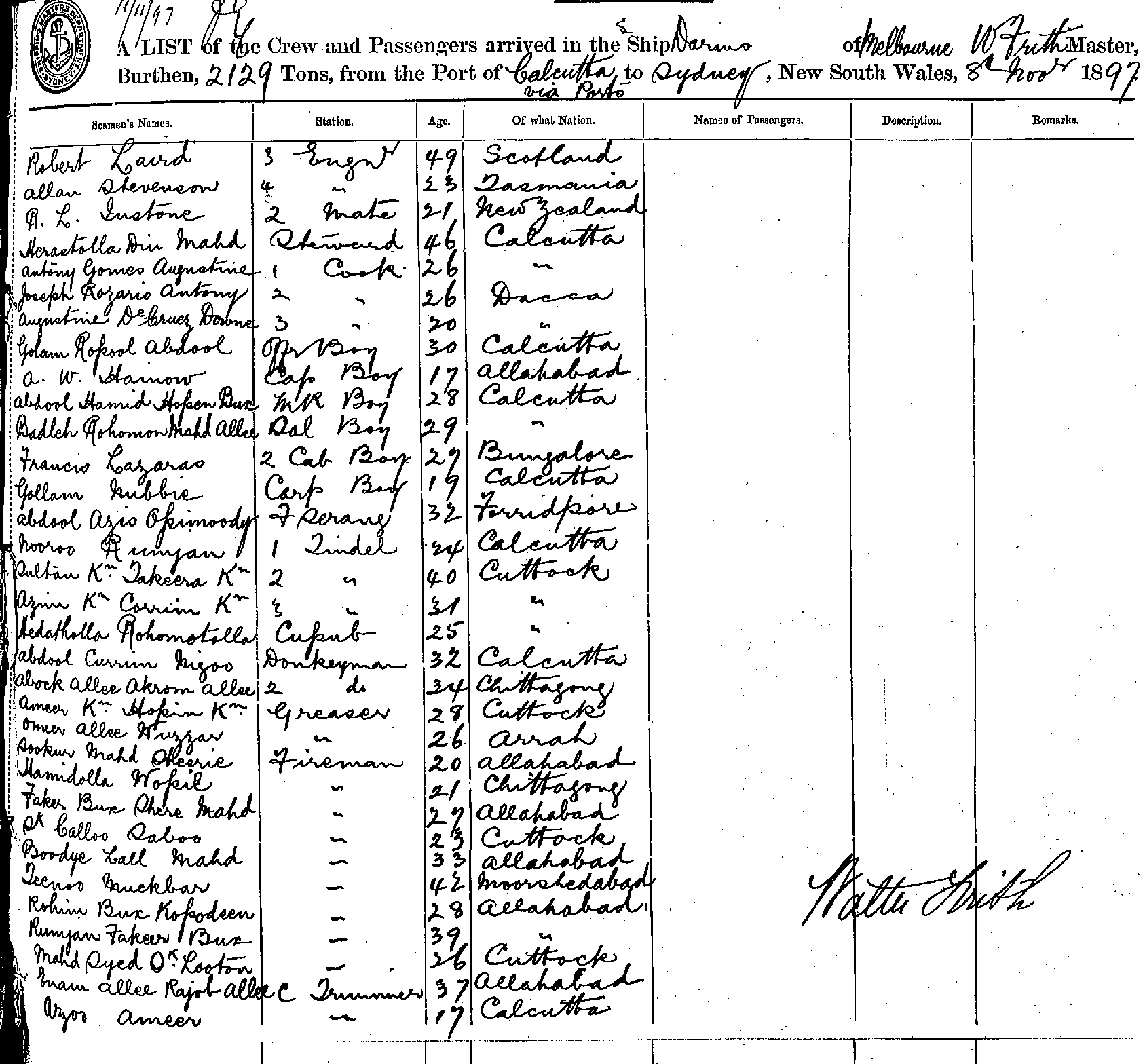 DARIUSOF MELBOURNE, WALTER FRITH, MASTER, BURTHEN 2129 TONS FROM THE PORTS OF CALCUTTA VIA PORTS TO SYDNEY NEW SOUTH WALES, 8TH NOVEMBER, 1897 |
