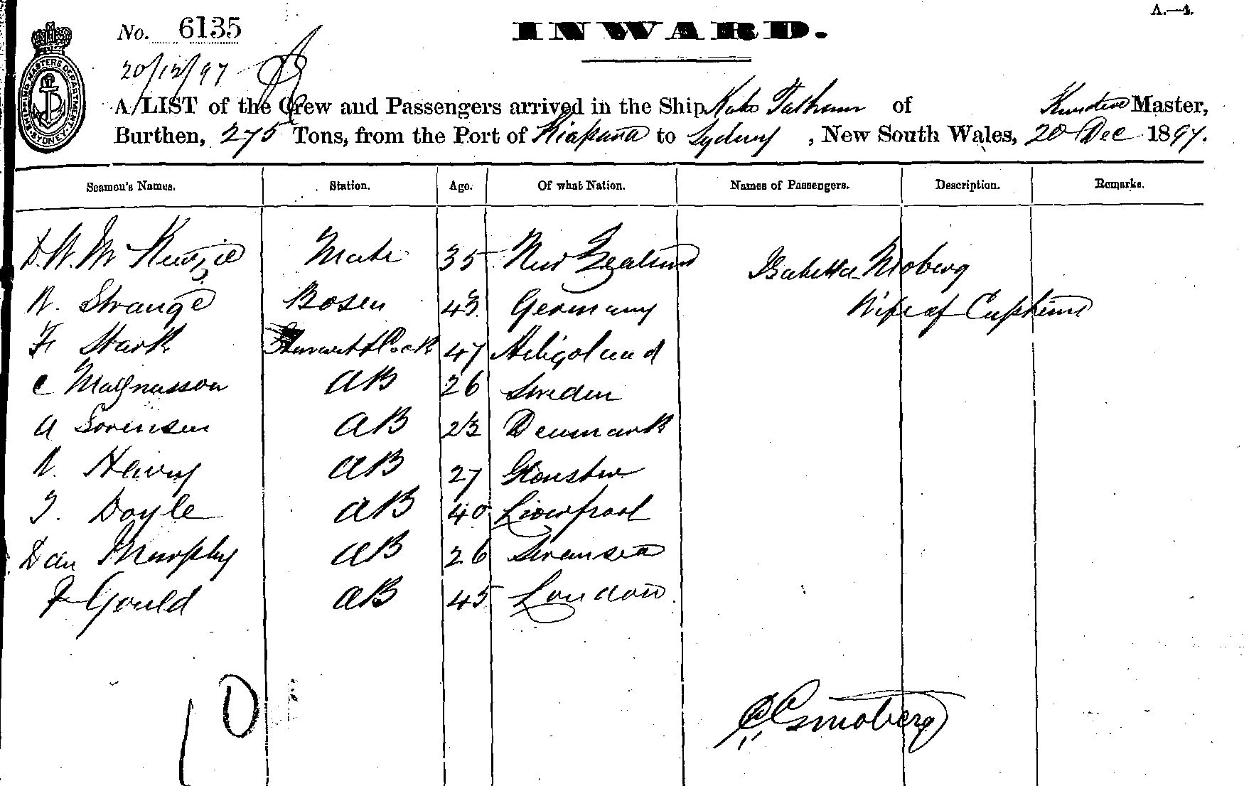 KATE TATHEMOF KUNDERE. C. G. MOBERG, MASTER, BURTHEN 275 TONS FROM THE PORT OF KIAPARA, TO SYDNEY, NEW SOUTH WALES, DEC 20, 18 97 |