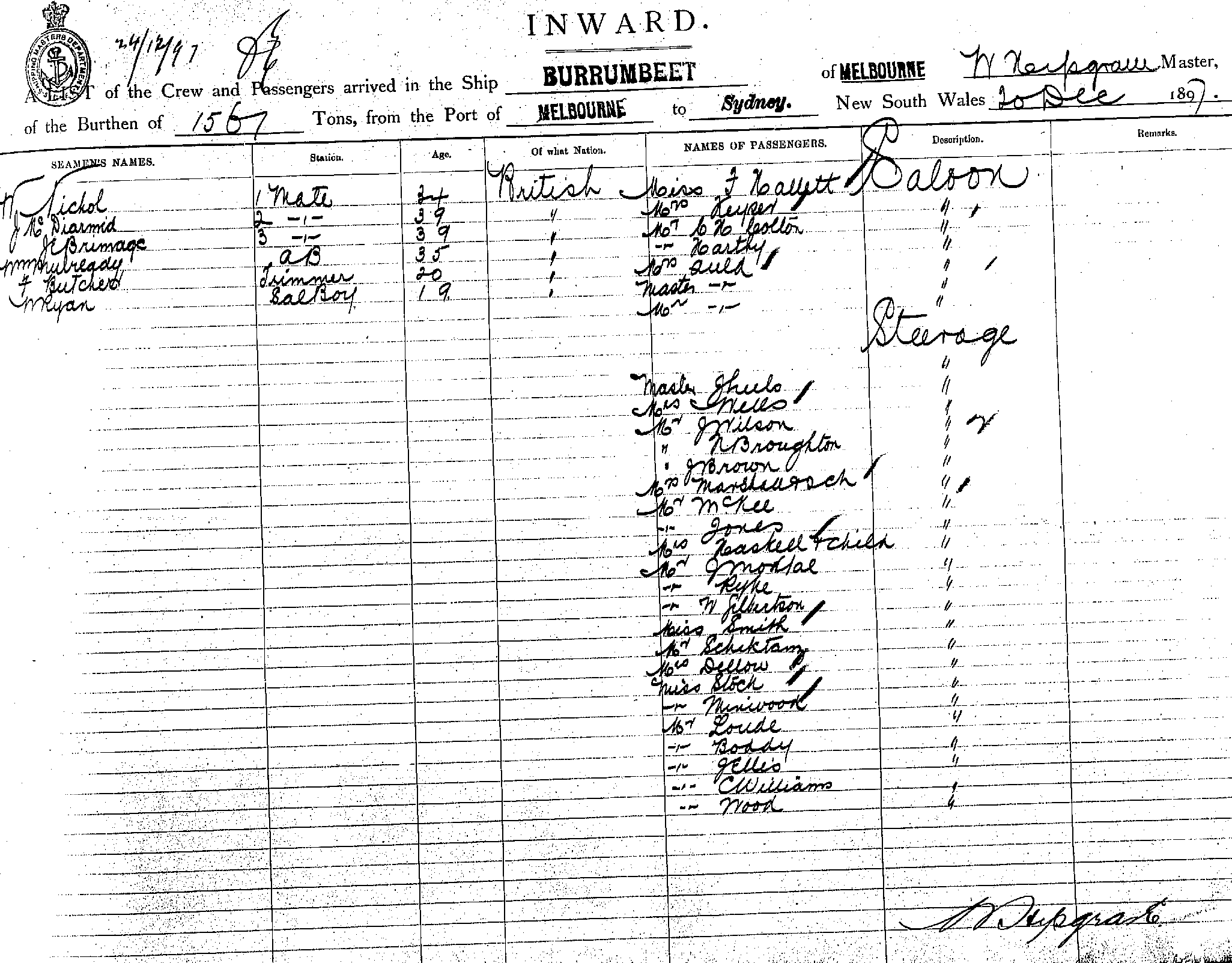 BURRUMBEETOF MELBOURNE, W. HIPGRAVE, MASTER, BURTHEN 1561 TONS FROM THE PORT OF MELBOURNE, TO SYDNEY, NEW SOUTH WALES, DEC 20, 18 97 |
