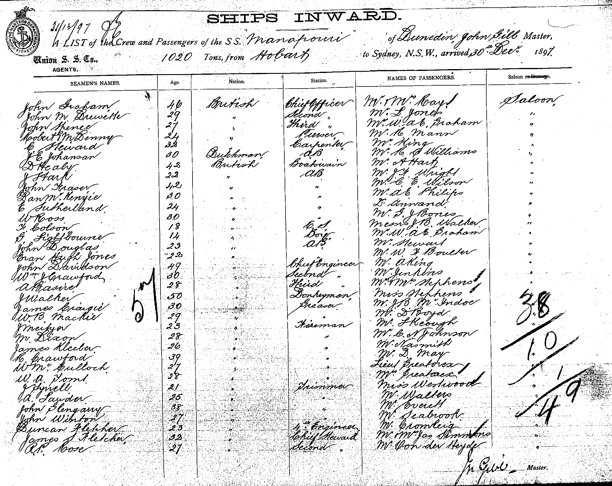 MANAPOURIOF DUNEDIN, J. GIBB, MASTER, BURTHEN 1020 TONS FROM THE PORT OF HOBART, TO SYDNEY, NEW SOUTH WALES, DEC 30, 18 97 |