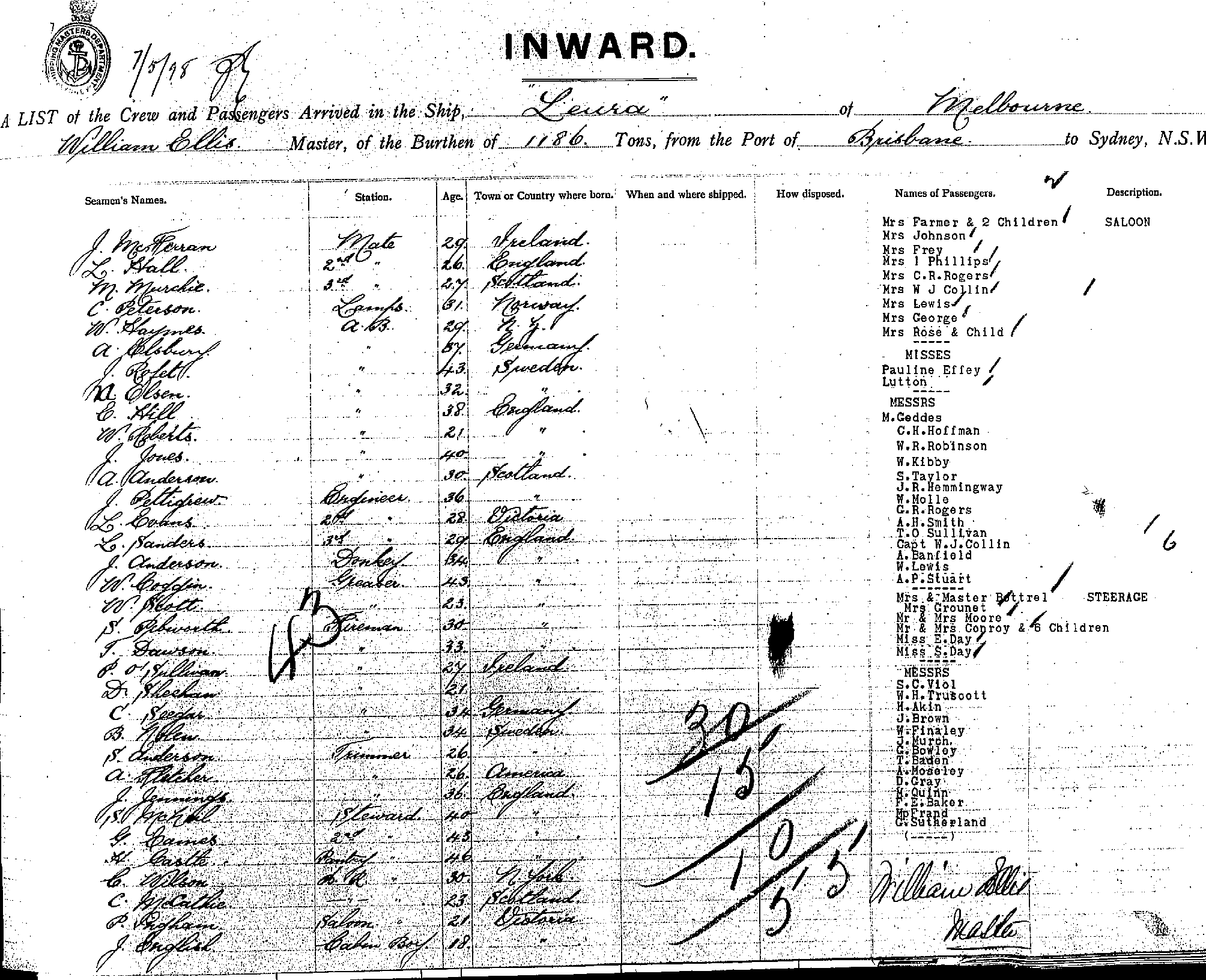 LEURAOF MELBOURNE, WILLIAM ELLIS, MASTER, BURTHEN 1168 TONS FROM THE PORT OF BRISBANE TO SYDNEY,NEW SOUTH WALES, 7TH MAY 1898 |
