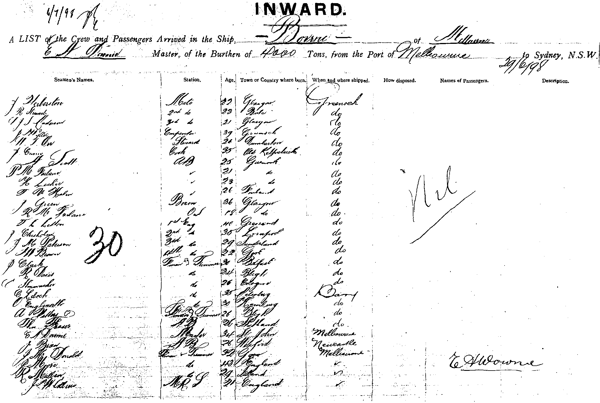 BOVRICOF MELBOURNE, E H DOWNIE, MASTER, BURTHEN4000 TONS FROM THE PORT OF MELBOURNE TO SYDNEY, NEW SOUTH WALES, 29 JUIN 1898 |