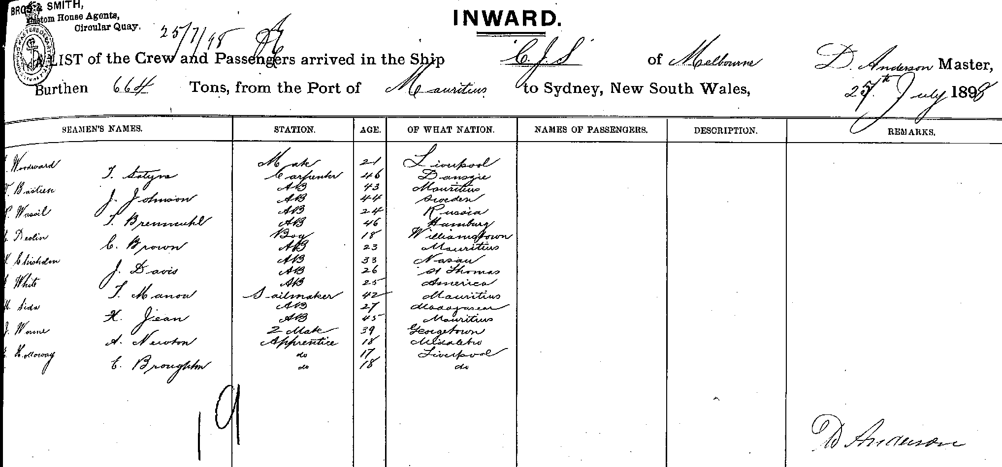 C J SOF MELBOURNE, D. ANDERSON, MASTER, BURTHEN 664 TONS FROM THE PORT OF MAURITIUS TO SYDNEY, NEW SOUTH WALES, 25TH JULY 1898 |