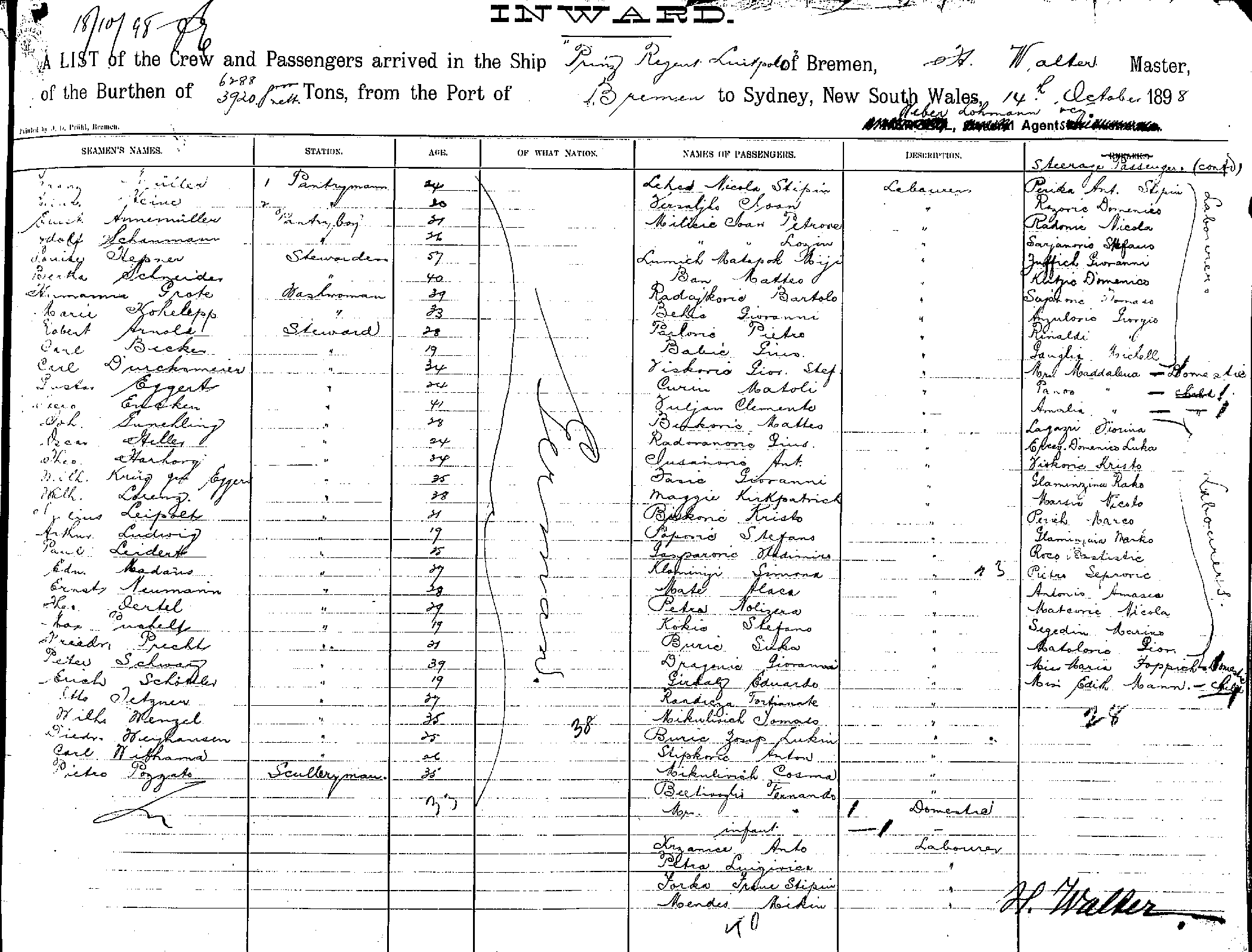 PRINZ REGENT LUITPOLDOF BREMEN, WALTER OR WALKER MASTER, BURTHEN 6288/3920 TONS FROM THE PORT OF BREMEN TO SYDNEY, NEW SOUTH WALES, 14TH OCTOBER 1898 |