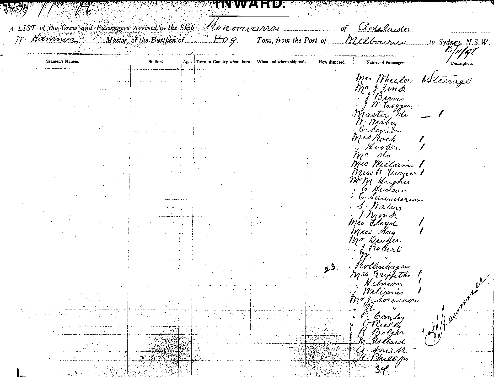 KONOOWARRAOF ADELAIDE, HAMMER MASTER, BURTHEN 809/1273 TONS FROM THE PORT OF MELBOURNE TO SYDNEY, NEW SOUTH WALES, 15TH NOVEMBER 1898 |