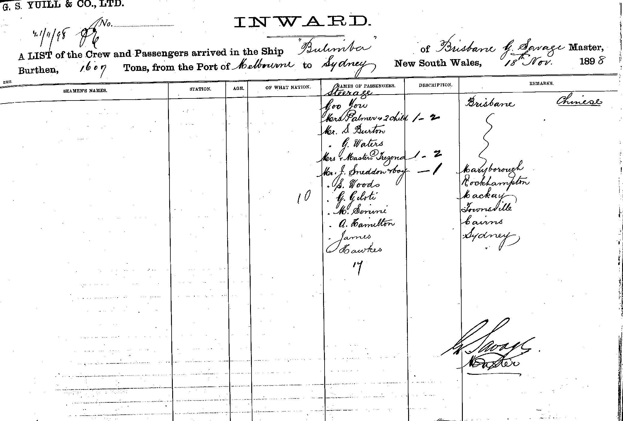 BULIMBAOF BRISBANE, SAVAGE MASTER, BURTHEN 1607/2510 TONS FROM THE PORT OF MELBOURNE TO SYDNEY, NEW SOUTH WALES, 18TH NOVEMBER 1898 |