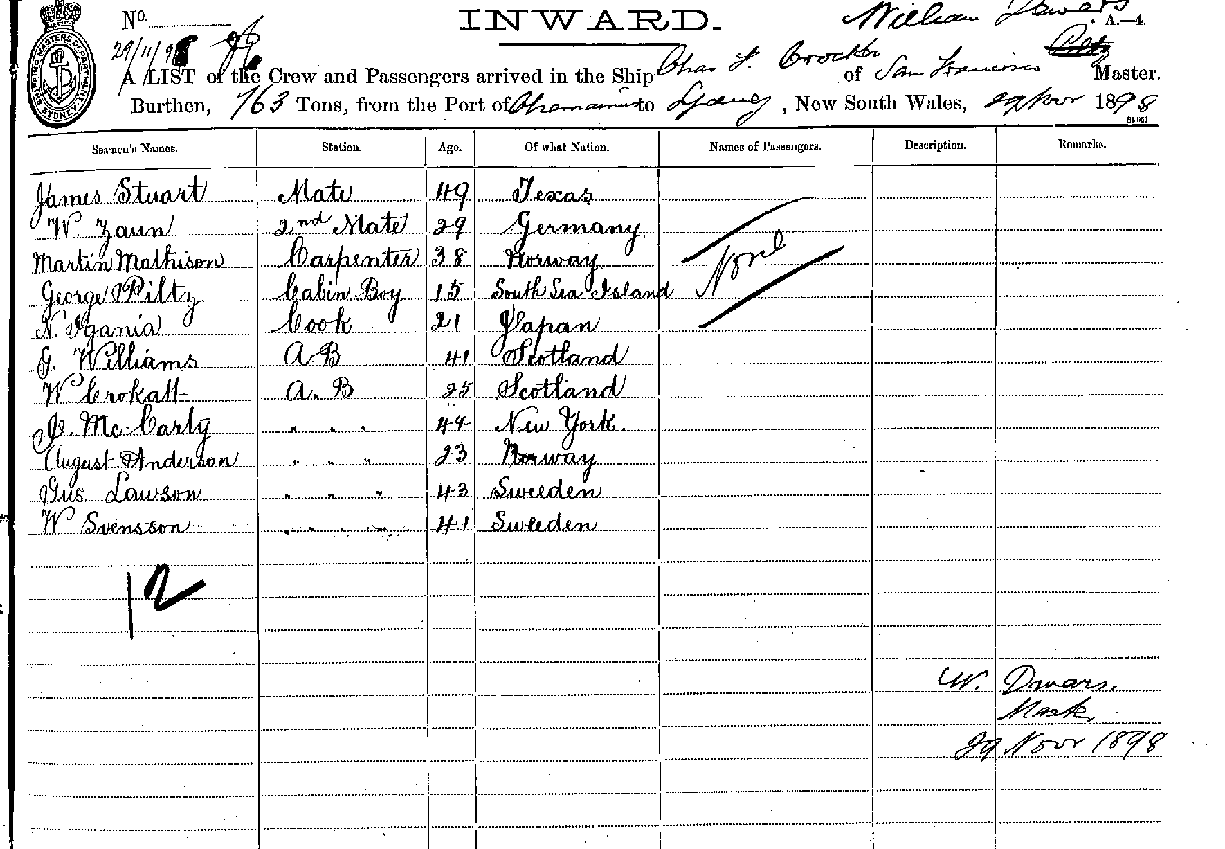 CHARLES F CROCKEROF SAN FRANCISCO, DEWARS MASTER, BURTHEN 763 TONS FROM THE PORT OF CHEMAINUX ? TO SYDNEY, NEW SOUTH WALES, 29TH NOVEMBER 1898 |