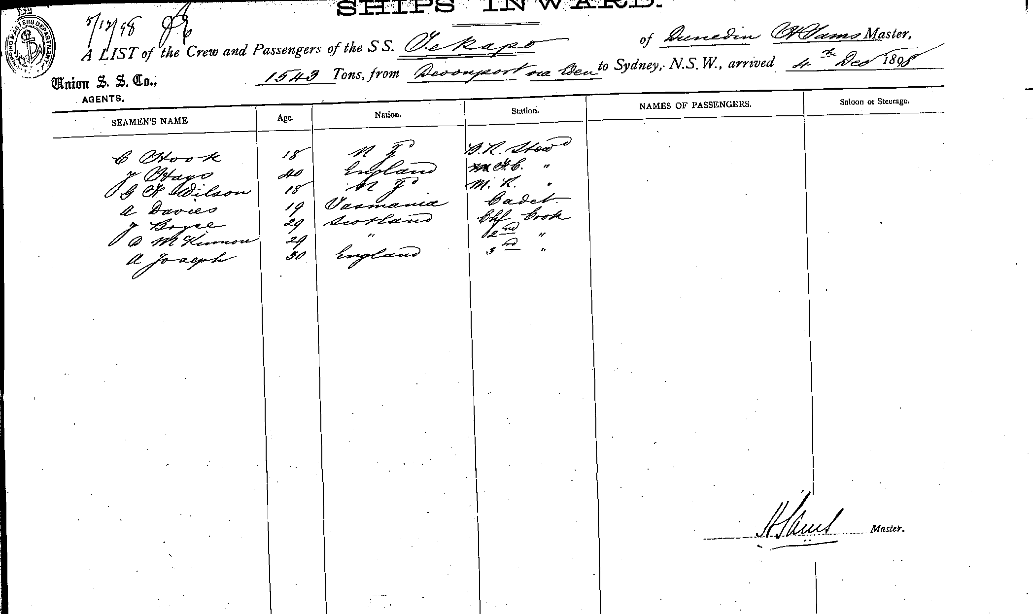 TEKAPOSTEAMSHIP OF DUNEDIN, SAMS MASTER, BURTHEN 1543/2439 TONS FROM THE PORT OF DEVONPORT via EDEN TO SYDNEY, NEW SOUTH WALES, 4TH DECEMBER 1898 |
