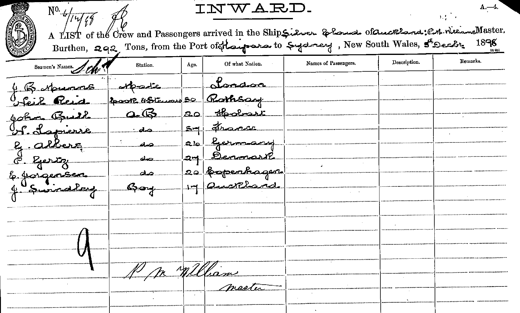SILVER CLOUDSCHOONER OF AUCKLAND, WILLIAMS MASTER, BURTHEN 292 TONS FROM THE PORT OF KAIPARA TO SYDNEY, NEW SOUTH WALES, 5TH DECEMBER 1898 |