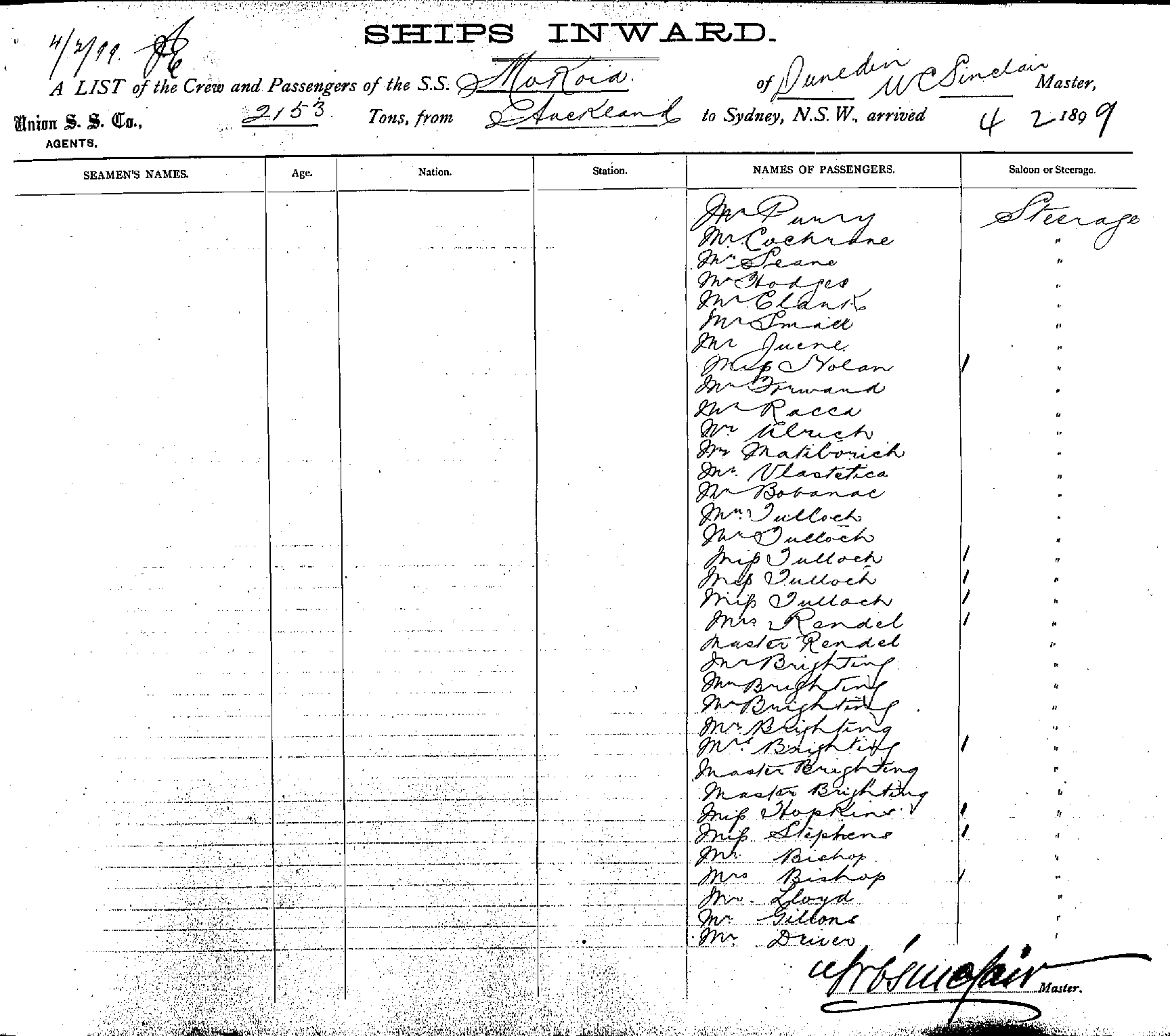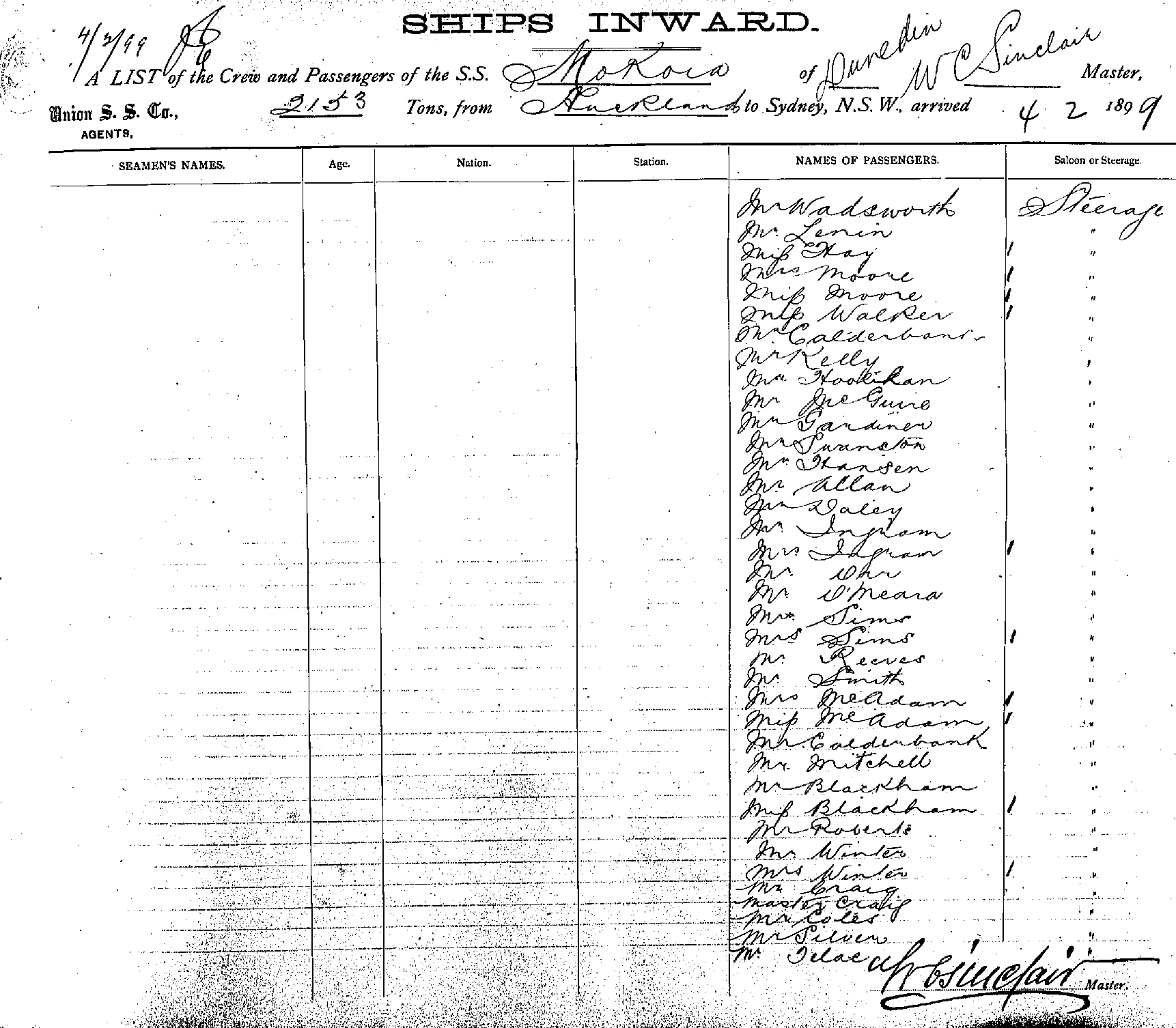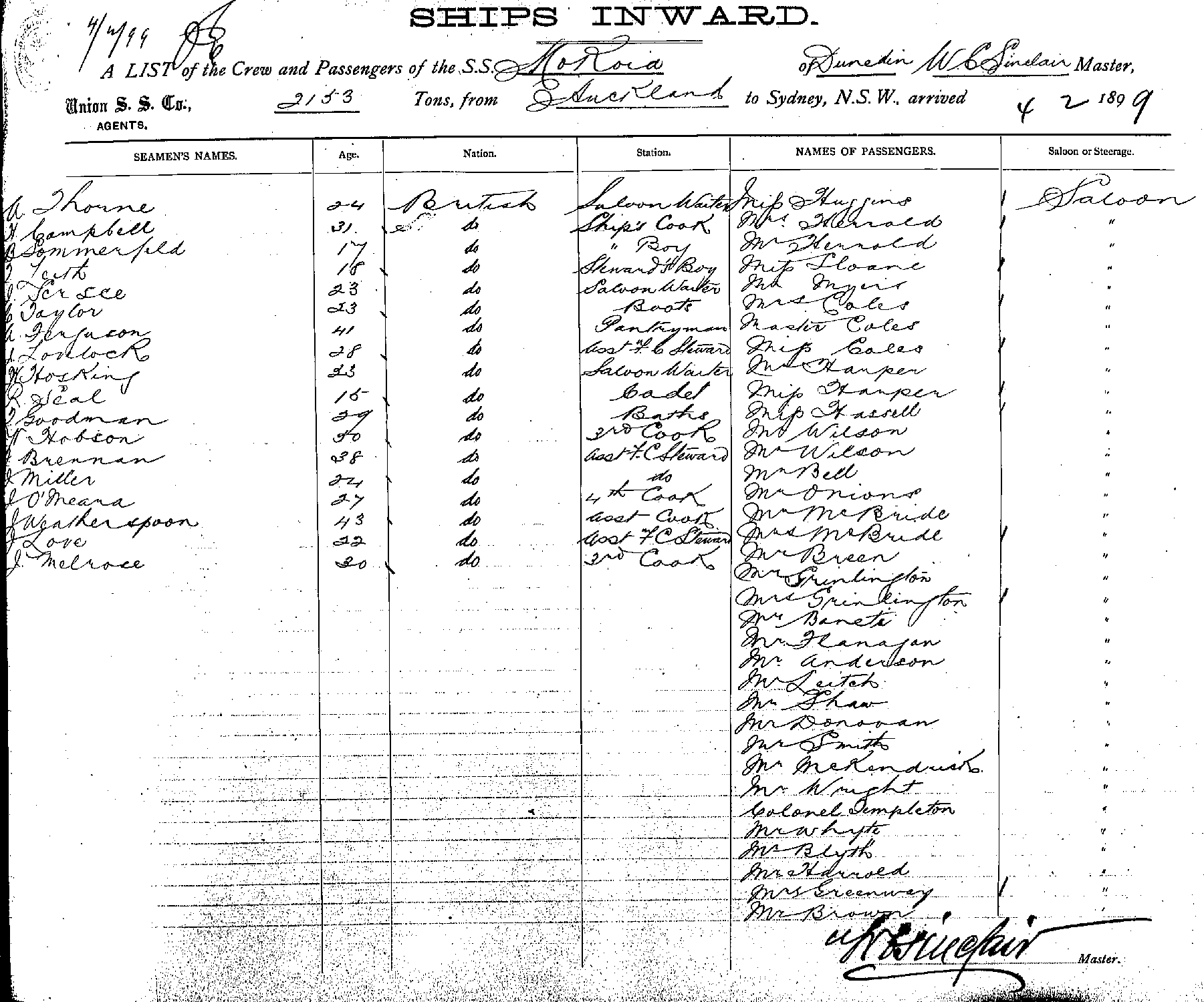 MOKOIAOF DUNEDIN, W.C . SINCLAIR, MASTER, BURTHEN 2153 TONS FROM THE PORT OF AUCKLAND TO SYDNEY, NEW SOUTH WALES, 4TH FEB, 1899 |