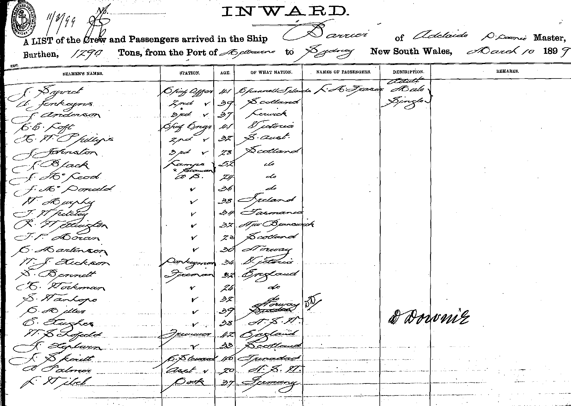 BARRIEROF ADELAIDE, DOWNIE, MASTER, BURTHEN 1790 TONS FROM THE PORT OF MELBOURNE TO SYDNEY, NEW SOUTH WALES. 10TH MARCH 1899 |