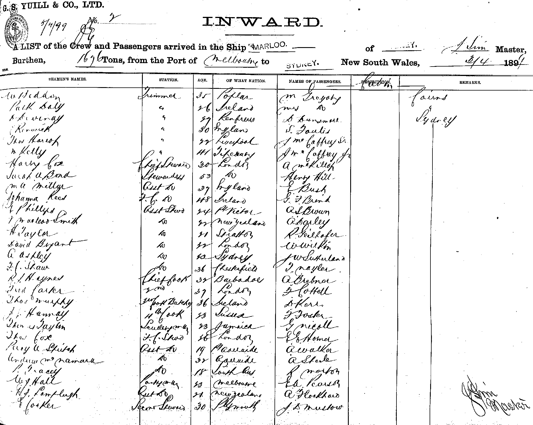 Source: State Records Authority of New South Wales: Shipping Master's Office; Passengers Arriving 1855 - 1922; NRS13278, [X258] reel 550. Transcribed by Bob Gilston. Proofread by Lyn & Maurie.