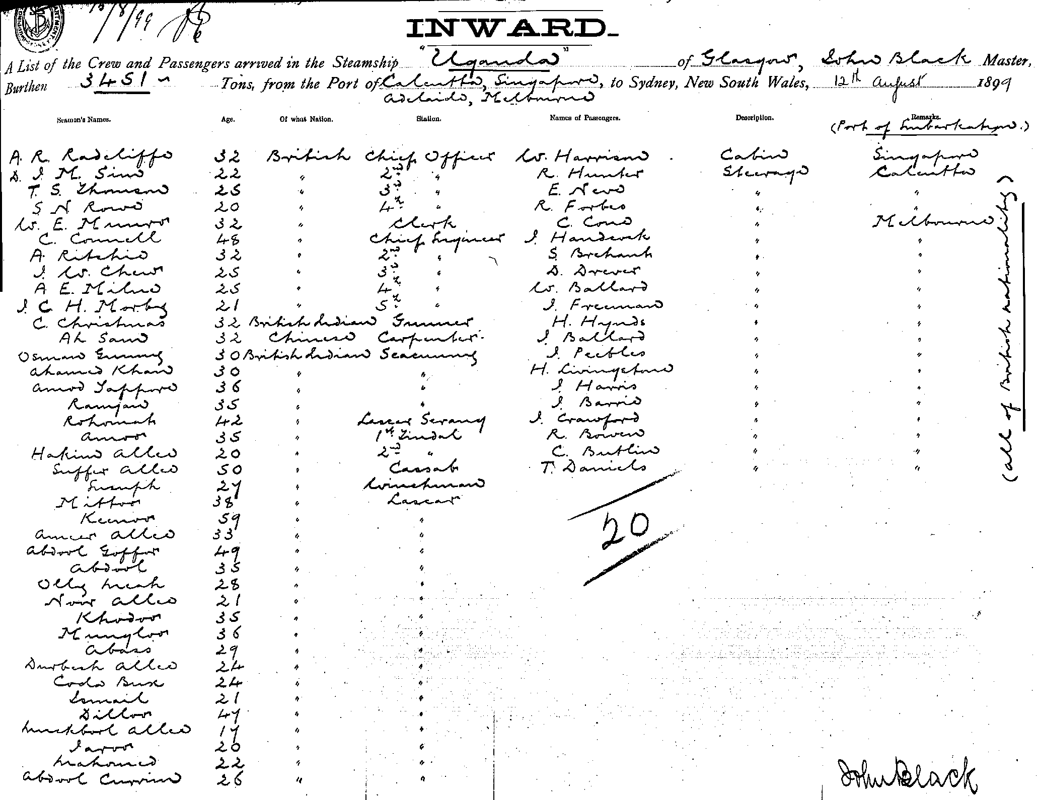 UGANDAOF GLASGOW, JOHN BLACK, MASTER, BURTHEN 3451 TONS FROM THE PORT OF CALCUTTA, SINGAPORE, ADELAIDE, MELBOURNE TO SYDNEY. NEW SOUTH WALES, 12TH AUGUST 1899 |