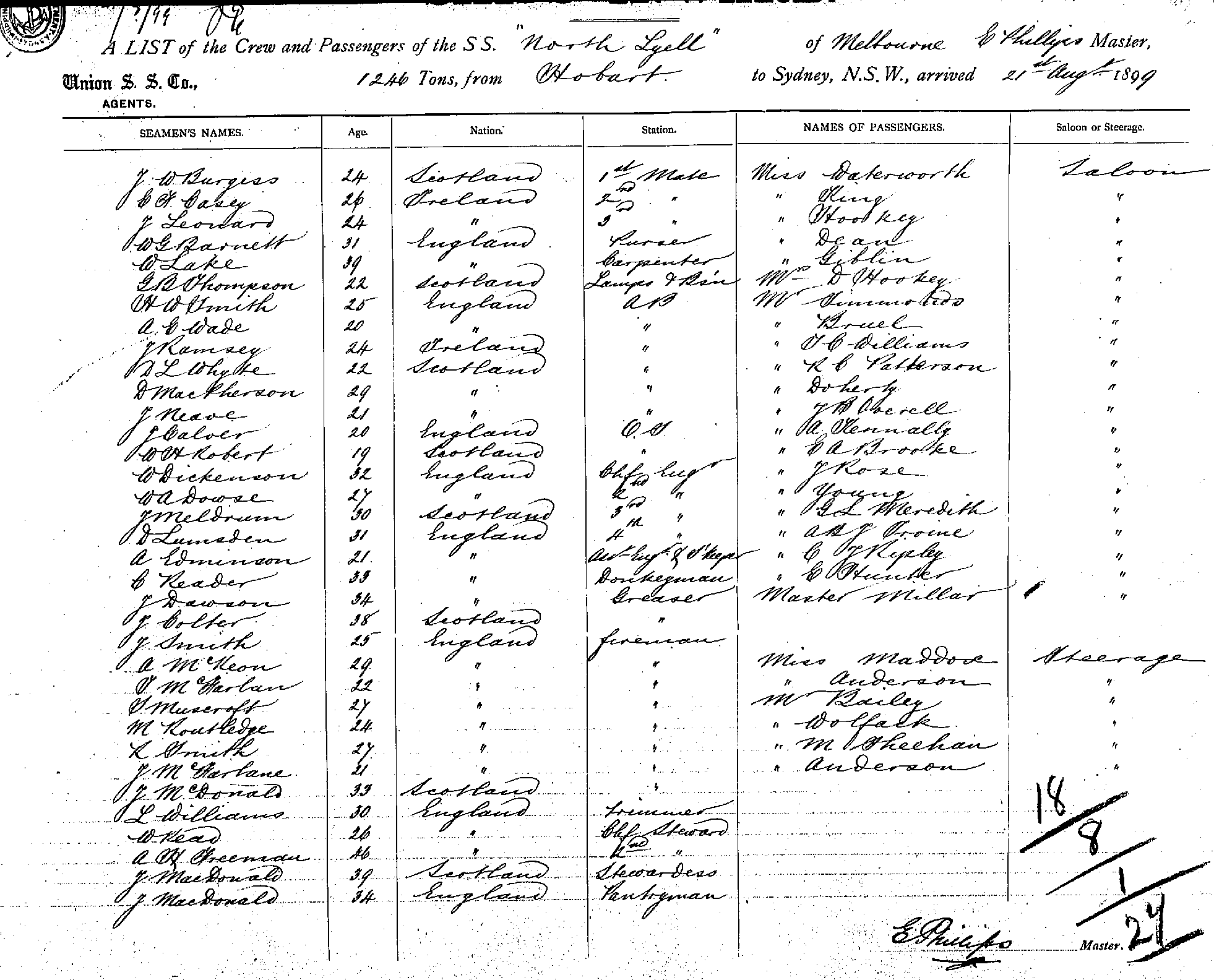 NORTH LYELLOF MELBOURNE, E. PHILLIPS, MASTER, BURTHEN 1246 TONS FROM THE PORT OF HOBART TO SYDNEY, NEW SOUTH WALES, 21ST AUGUST 1899 |