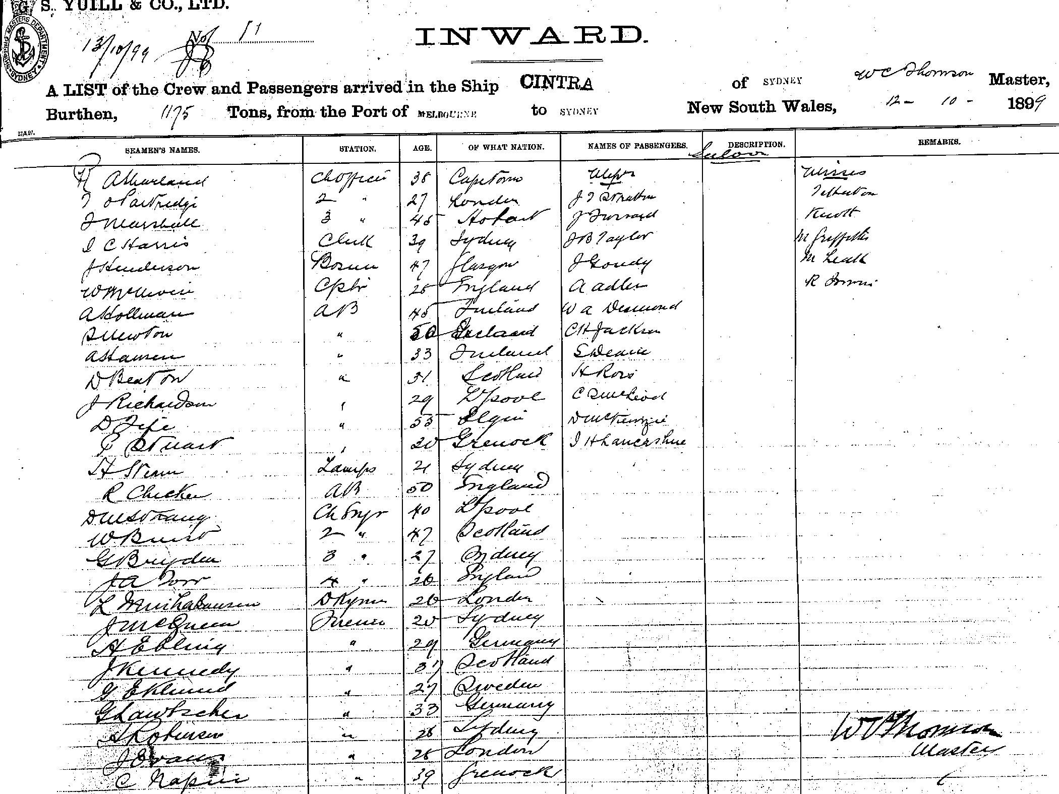 CINTRAOF SYDNEY, W. C THOMSON, MASTER, BURTHEN 1175 TONS FROM THE PORT OF MELBOURNE TO SYDNEY, NEW SOUTH WALES, 12TH OCTOBER 1899 |