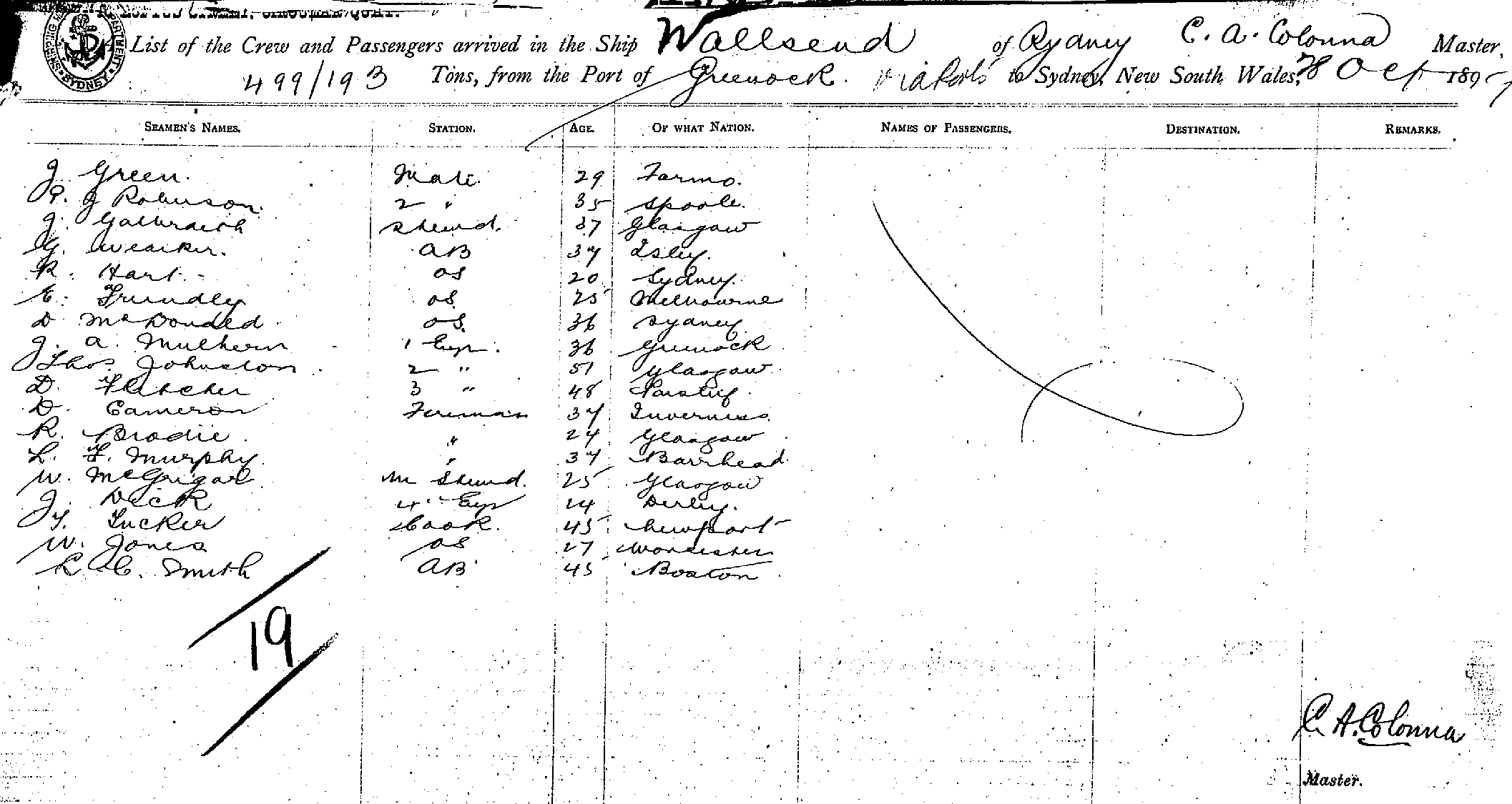 WALLSENDOF SYDNEY, C. A. COLANNA, MASTER, BURTHEN 499/193 TONS FROM THE PORT OF GREENOCK via PORTS TO SYDNEY, NEW SOUTH WALES, 28TH OCTOBER 1899 |