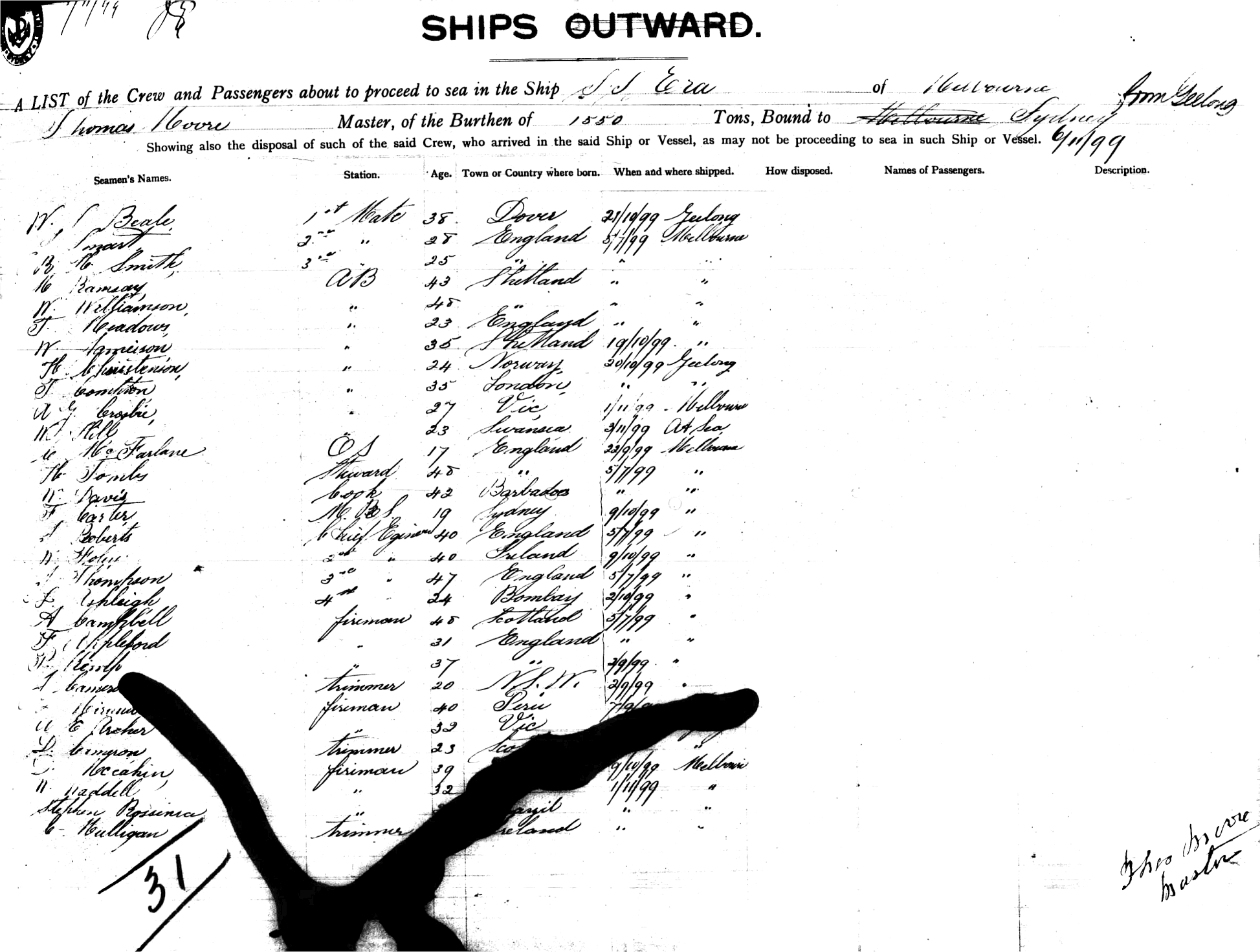ERAOF MELBOURNE, THOMAS MOORE MASTER, BURTHEN 1550 FROM THE PORT OF GEELONG TO SYDNEY NEW SOUTH WALES 6TH NOVEMBER, 1899 |