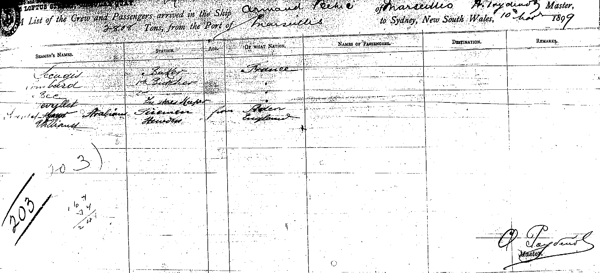 ARMAND BEHICOF MARSEILLES, H. POYDENOT, MASTER, BURTHEN 2808 TONS FROM THE PORT OF MARSEILLES VIA MELBOURNE TO SYDNEY, NEW SOUTH WALES, 10TH NOVEMBER 1899 |