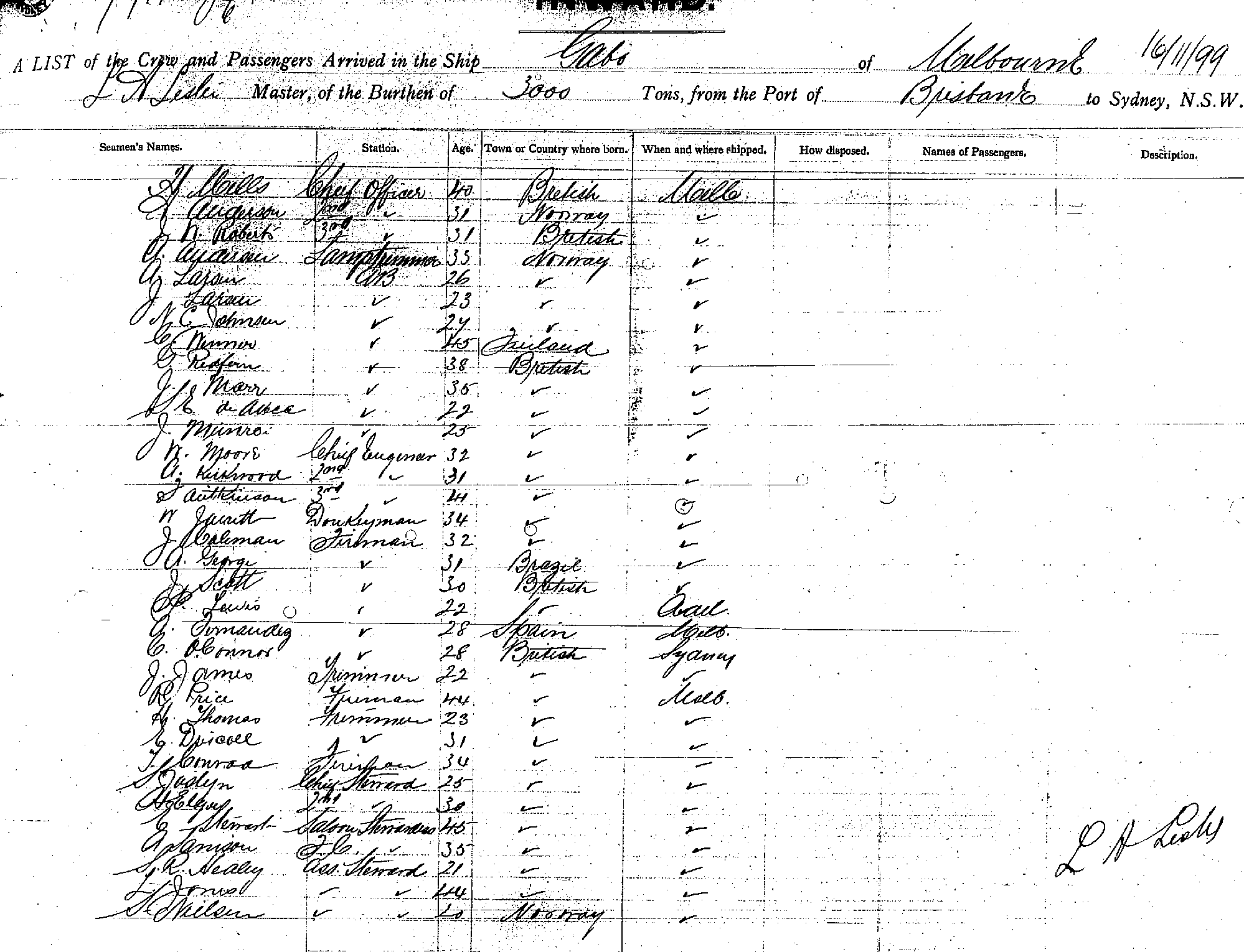 GABOOF MELBOURNE, L A LESLIE, MASTER, BURTHEN 3000 TONS FROM THE PORT OF BRISBANE TO SYDNEY, NEW SOUTH WALES, 16 NOV. 1899 |