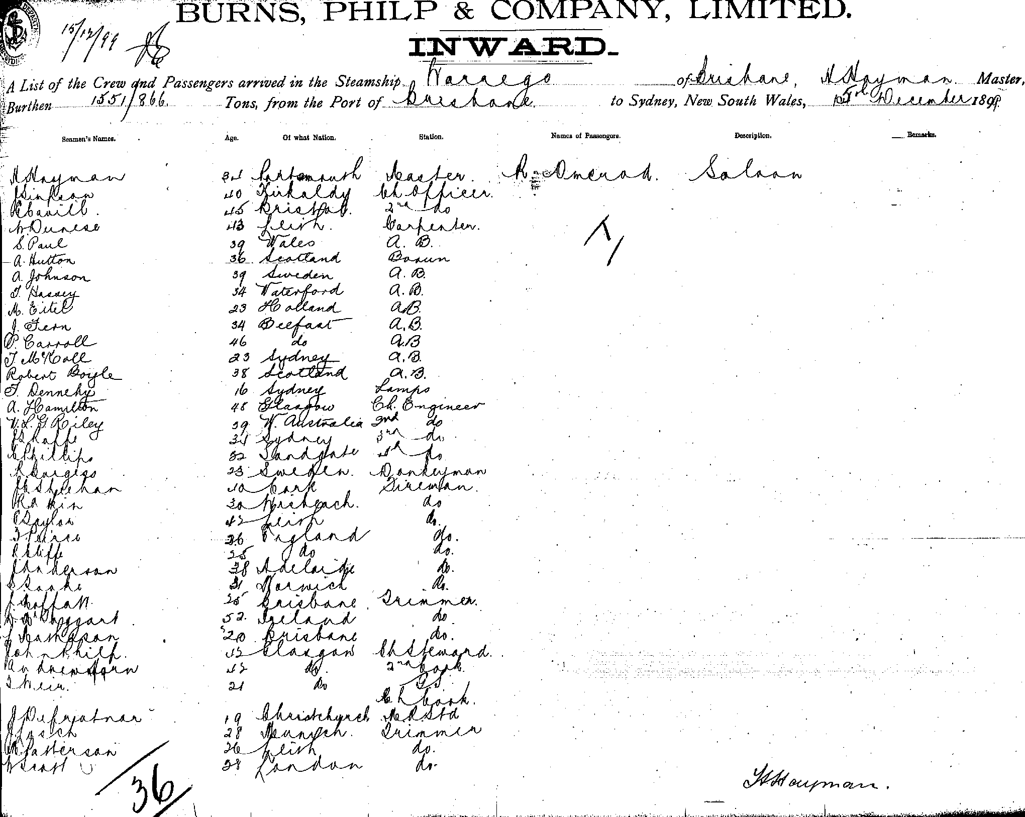 WARREGOOF BRISBANE, H. HAYMAN, MASTER, BURTHEN 1551 / 866 TONS FROM THE PORT OF BRISBANE TO SYDNEY, NEW SOUTH WALES, 15TH DECEMBER 1899 |