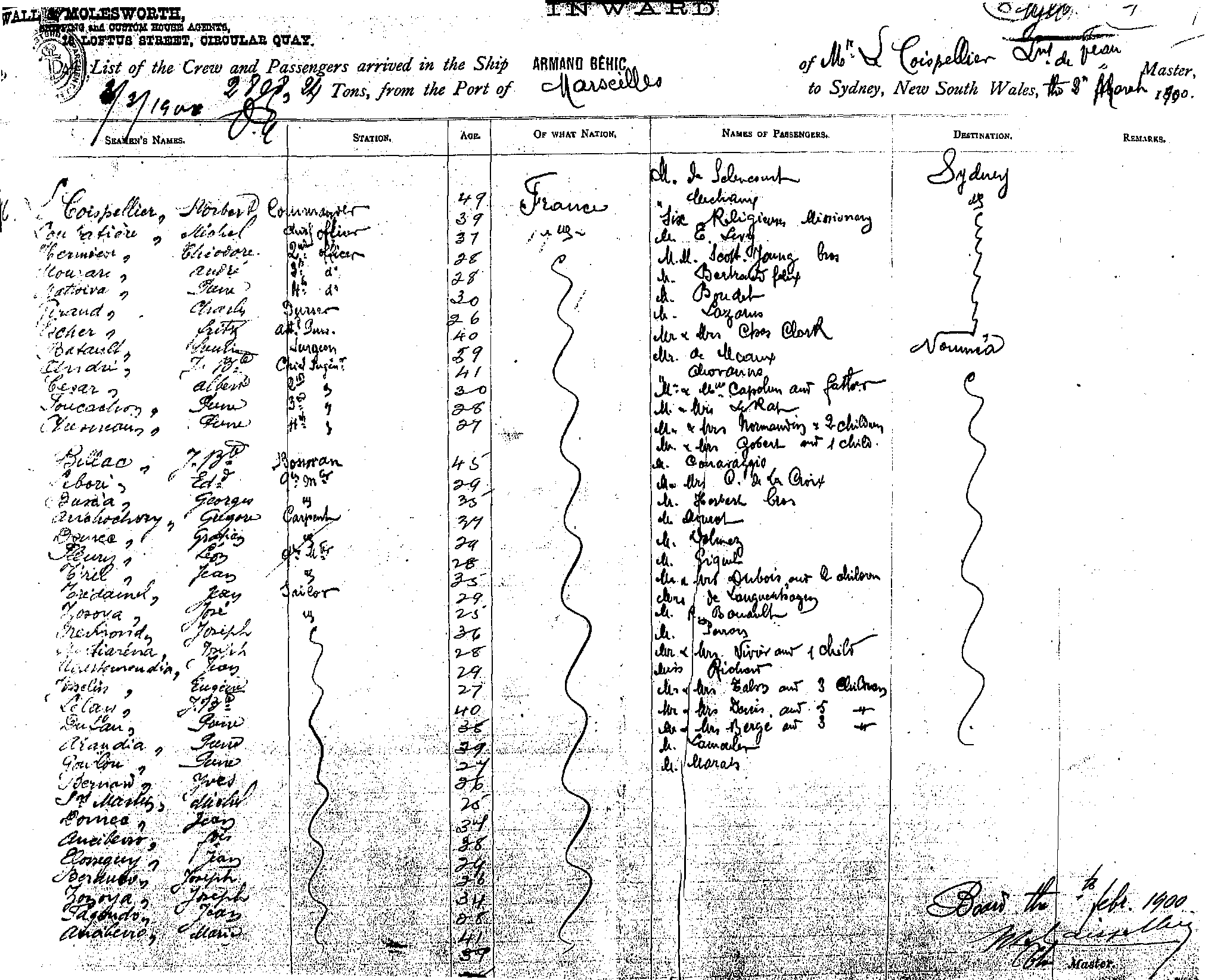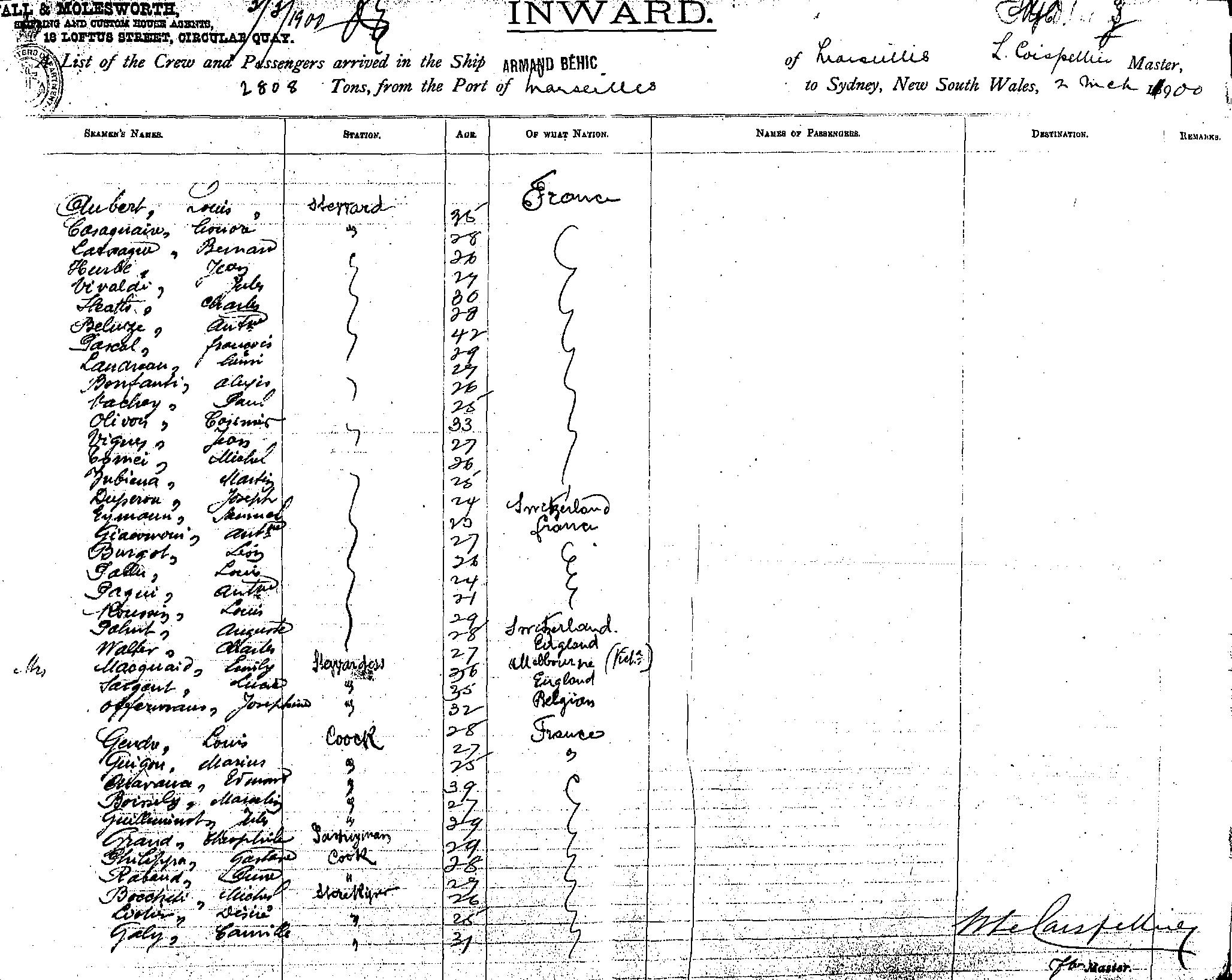 ARMAND BEHICOF MARSEILLES, LE COISPELLIER, MASTER, BURTHEN 2808 TONS FROM THE PORT OF MARSEILLES TO SYDNEY, NEW SOUTH WALES, 2ND MARCH 1900 |