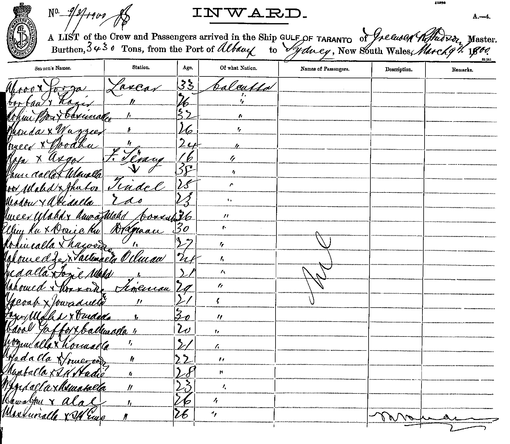 GULF OF TARANTOOF GREENOCK, R. HUDSON, MASTER, BURTHEN 3430 TONS FROM THE PORT OF CAPETOWN via ALBANY TO SYDNEY, NEW SOUTH WALES, 9TH MARCH 1900 |
